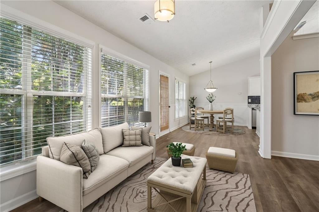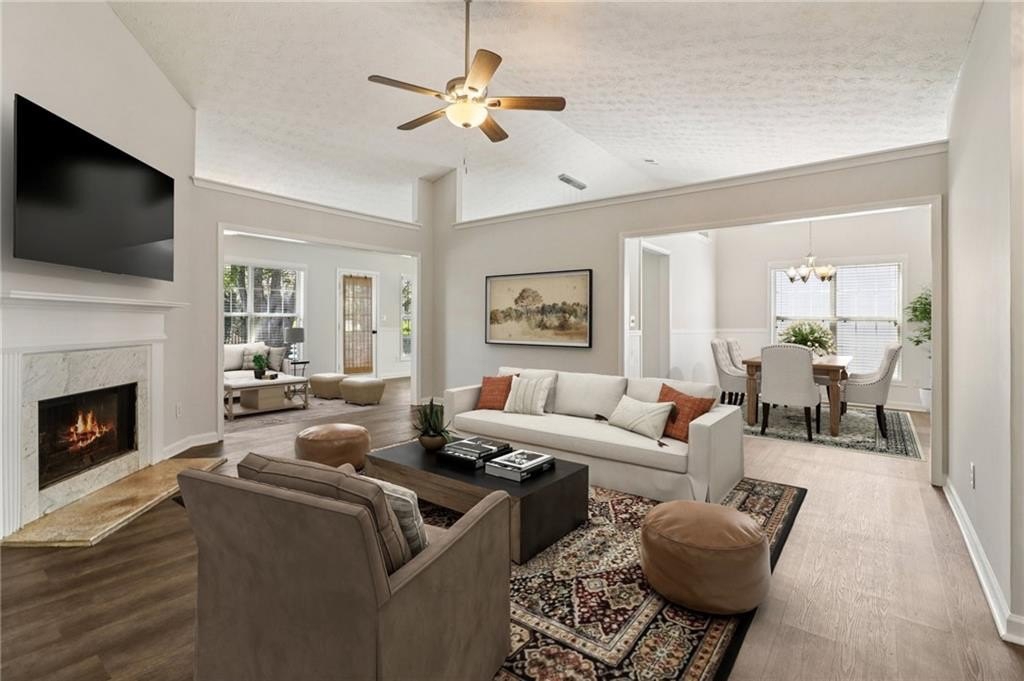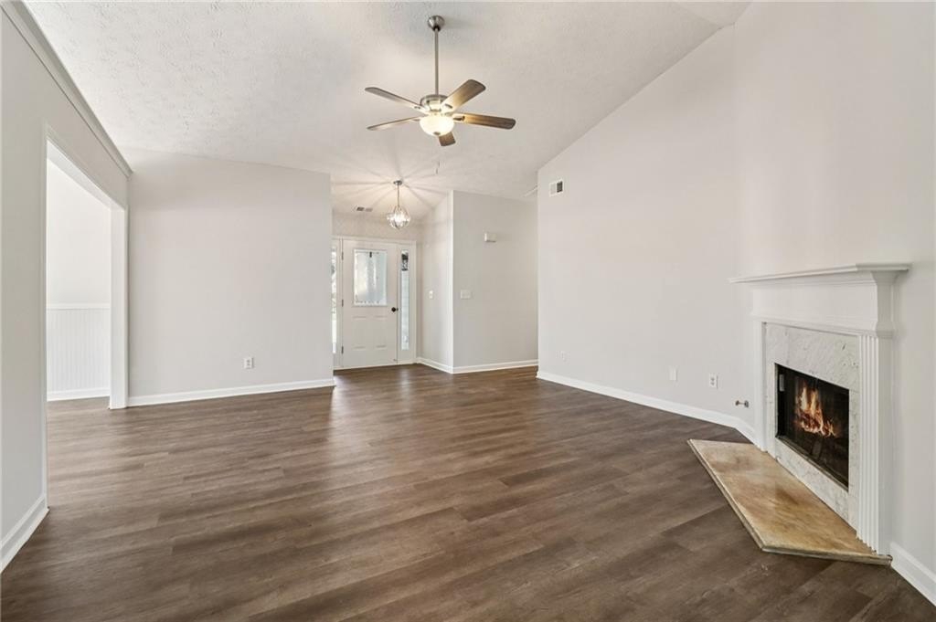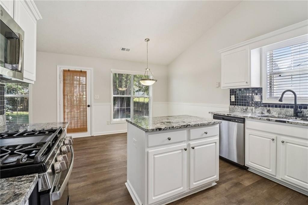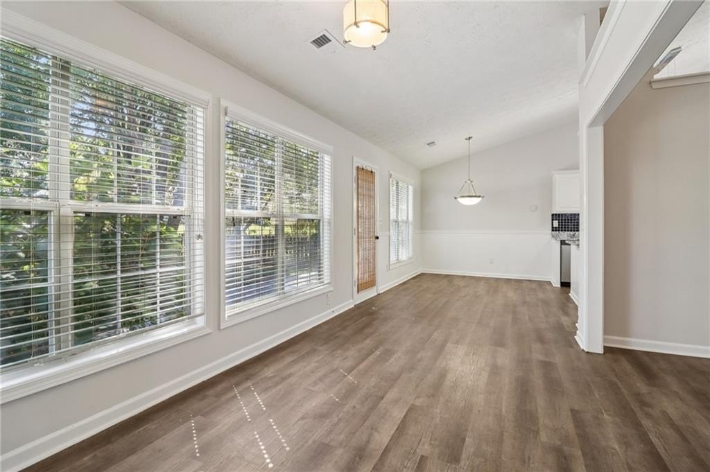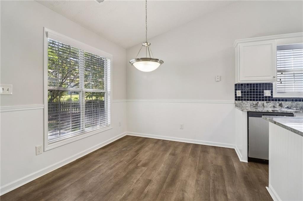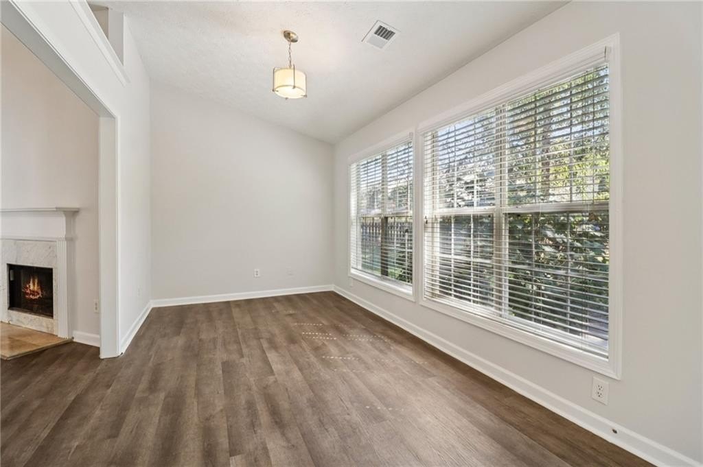 Lovely Single-Story Home with Bright, Open Spaces! This inviting home features a sweeping front yard and welcoming porch. Inside, beautiful, easy-to-maintain vinyl wood floors run throughout the living areas and bedrooms—no carpet! The open-concept living room offers a cozy fireplace, while an architectural entryway leads to the formal dining room with chair railing. A bright sunroom with a wall of windows makes the perfect reading nook or relaxing retreat. The on-trend kitchen includes white cabinetry, granite countertops, tile backsplash, stainless steel appliances, and a center island, plus a breakfast room overlooking the private backyard. The primary suite features a vaulted ceiling and en-suite bath with dual vanities, a soaking tub, and a fully tiled walk-in shower. Two additional spacious bedrooms and a full bath provide plenty of room for everyone. Enjoy outdoor living in the fenced backyard with mature trees, green space, and a patio ideal for grilling and entertaining. Community amenities include a clubhouse, pool, and playground. Conveniently located near schools with easy access to shopping and dining, this home offers both comfort and convenience! Book your tour today!