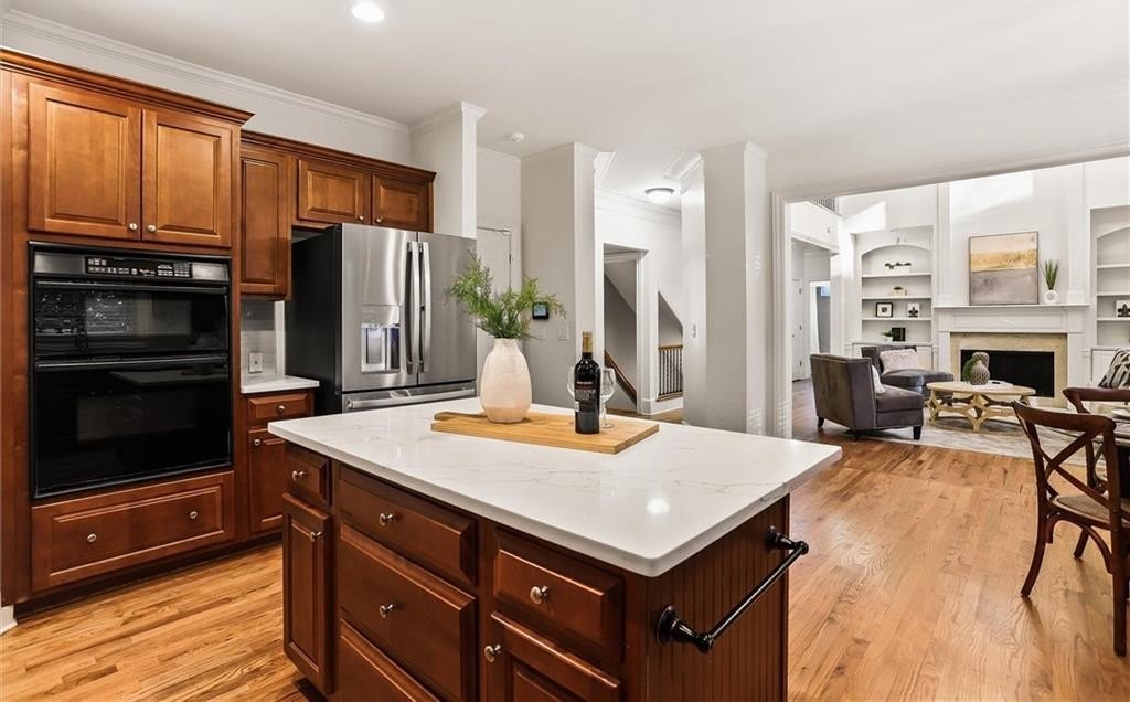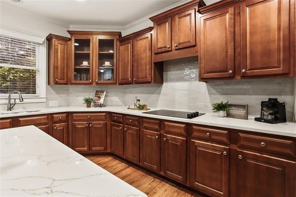 Inside, you’ll find newly refinished hardwood floors, fresh interior paint, plush new carpet, updated lighting, and a brand-new stovetop. The bright kitchen features new quartz countertops with designer subway tile, ample cabinetry, and a large prep island that flows seamlessly to the wrap-around Trex deck—perfect for morning coffee or evening grilling.
