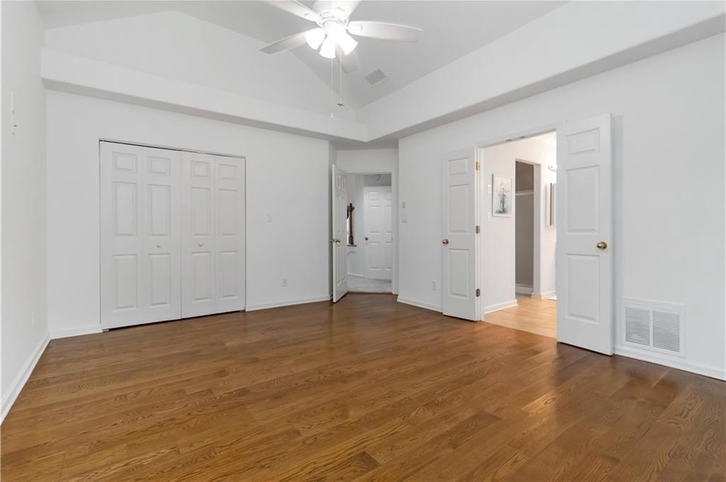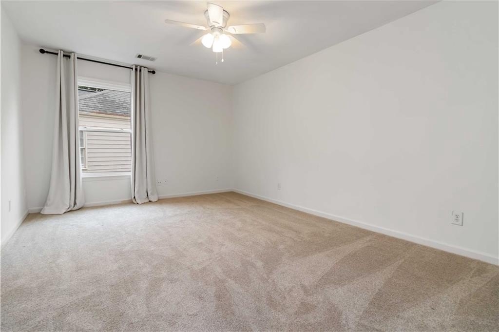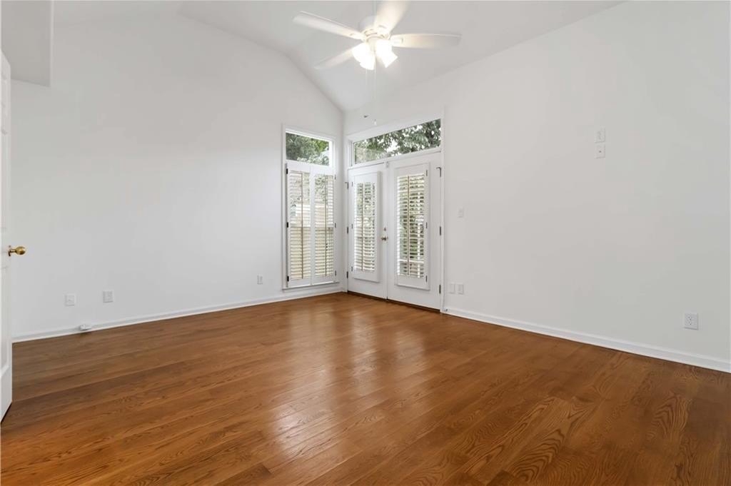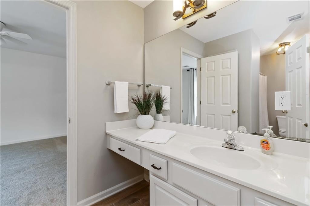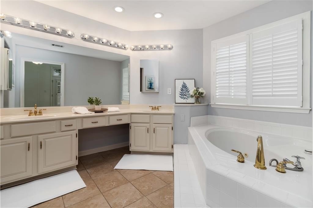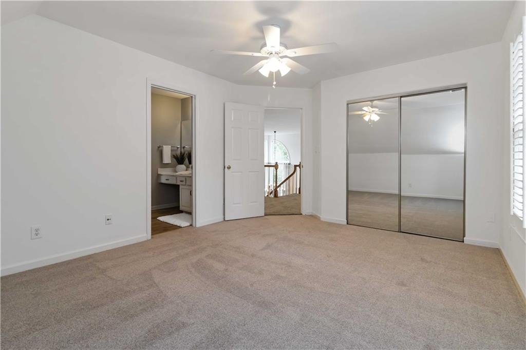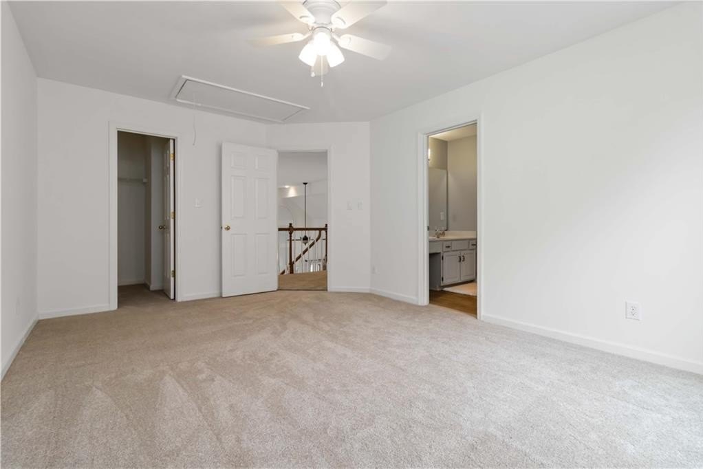 The main-level primary suite offers a serene retreat with newly refinished hardwood floors, a tray ceiling, generous walk-in closet, and private access to the fenced patio—ideal for morning coffee or evening wind-downs. The spa-like en-suite bath features double vanities, a brand-new soaking tub, and a separate shower. Upstairs, two spacious bedrooms share a stylish Jack-and-Jill bathroom, with a versatile loft space. Enjoy the privacy of a low-maintenance courtyard backyard, nestled on a level cul-de-sac lot. This home has been meticulously updated with fresh neutral paint, double-pane windows, zoned HVAC, and a security system for modern comfort and peace of mind. Hardwood flooring under most carpet.