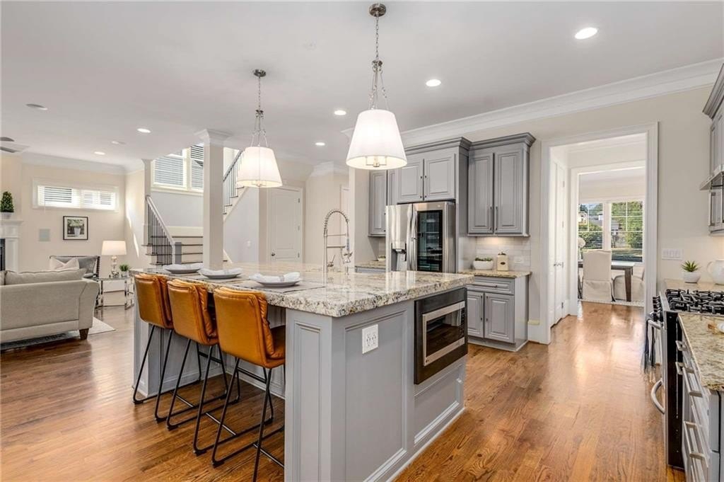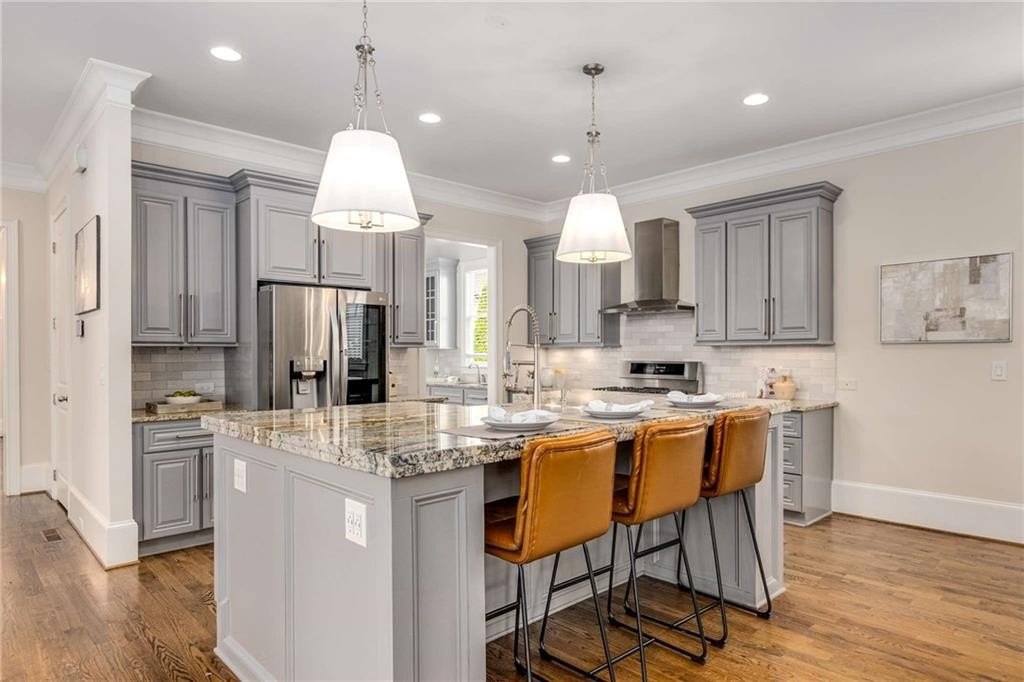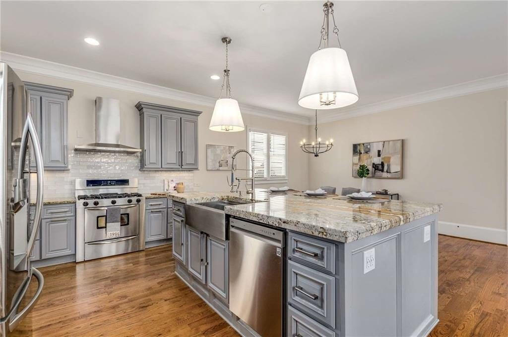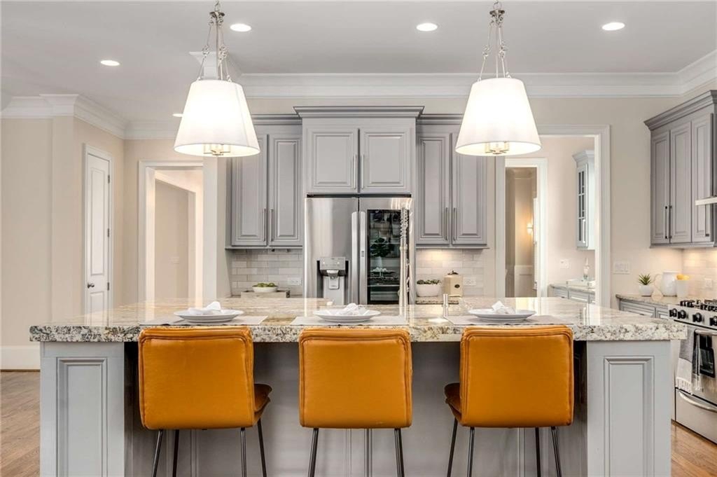 impresses with stainless steel appliances, a luxurious double-stacked granite island with