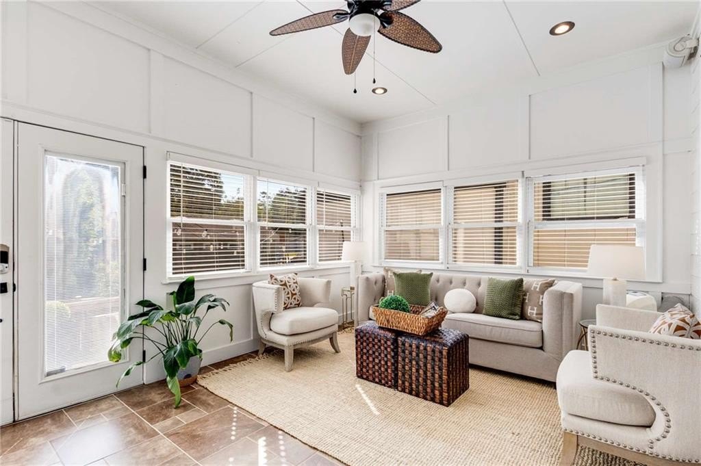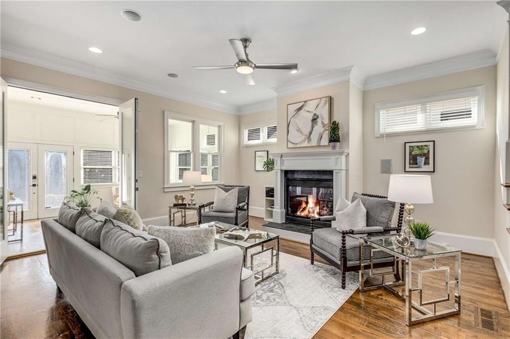 around a cozy fireplace and opens to an enclosed sun porch and deck for seamless