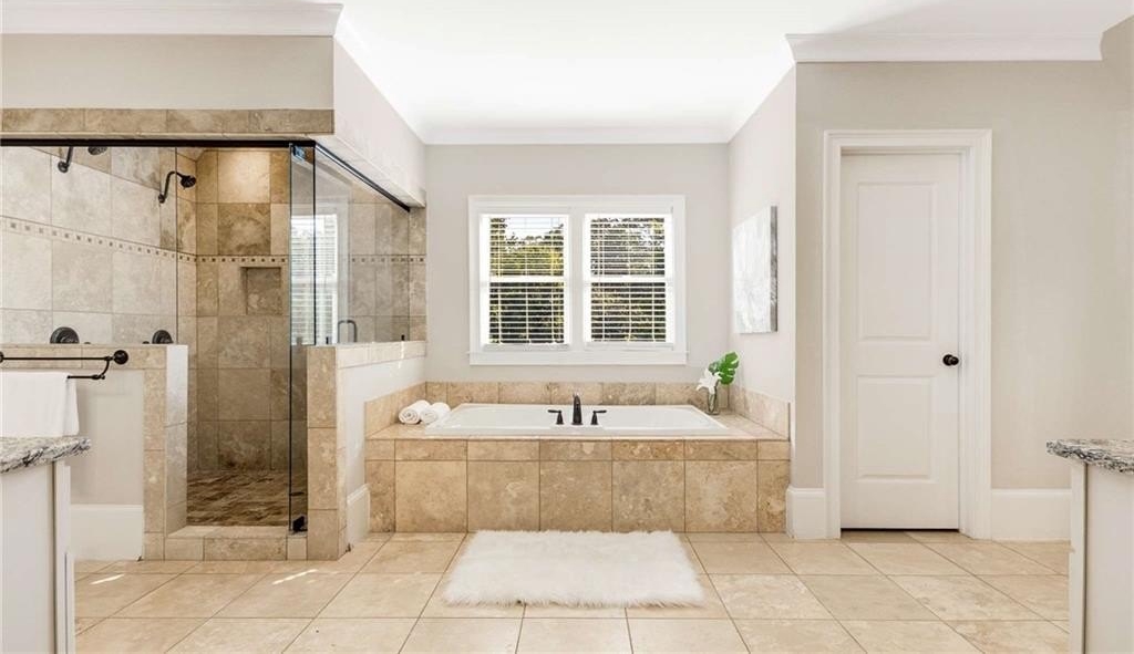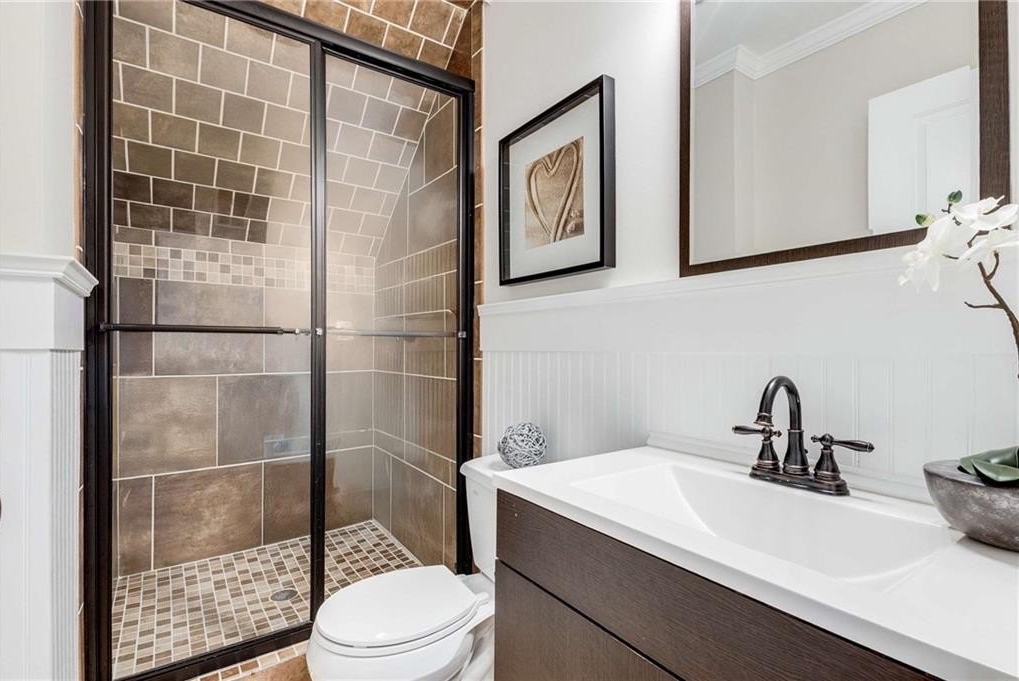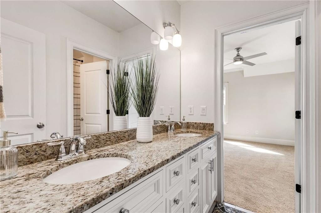 and an oversized frameless shower with dual shower heads. A second ensuite bedroom