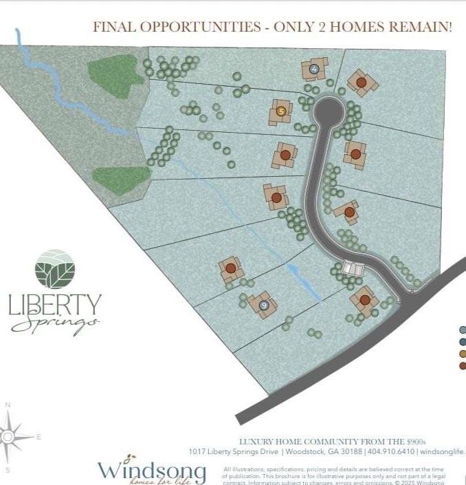 Lot 4 Windsong’s Wesleyan plan - PRICE IMPROVEMENT ON FINAL OPPORTUNITY - MOVE IN READY Custom home with basement and 2 car garage nestled on a fairytale 1.38 acre homesite nestled in the woods - You'll love living in Liberty Springs, a Woodstock community of only 10 homes on 1 + acre homesites. Liberty Springs is conveniently located close to Hickory Flat, Crabapple and Woodstock and is a community by Obie and Guildmaster award-winning builder Windsong Properties! This home is unique as it is set atop a hill like a gem providing beautiful views of the North Georgia Mountains. This example of the Wesleyan floor plan boasts a full unfinished basement, 5 total bedrooms with 4 total full baths. It’s a MUST SEE! Enjoy wooded backyard and huge side yard from your covered back porch as well as from your generous kitchen and family room. This home offers wide-open living spaces to enjoy time with family and friends. Along with the soaring 10’ ceilings on the main level and 9’ on 2nd level, this home is decked out with high-end options you won't find anywhere else. Enjoy the open feel as you enter and cozy up to the modern gas log fireplace in the Great Room that opens to the gourmet kitchen. Kitchen boasts quartz countertops, tile backsplash with 42” Shrock Entra cabinets with soft-close doors and drawers with a contrasting island along with Kitchen Aid stainless appliances with a large vent hood, gas cooktop and built microwave and oven. A Guest suite/office and a full bathroom are also located on the main level. The Guest Suite bath has a large tiled standing shower and frameless shower door. The second floor has 4 spacious bedrooms, 3 en-suite baths and a large laundry room with laundry sink with access from owners’ closet and hallway that makes laundry a breeze! A luxurious Owners Suite provides space for a sitting area and a beautiful spa bath with a large, tiled shower with frameless shower door, separate vanities and a stunning stand-alone tub. The 3 additional spacious bedrooms have generous-sized closets so there is a place for everything. This home is staged to highlight its livability. Sod with sprinkler system and termite bait system in yard.