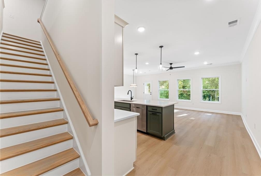Step inside this stylish 3-bedroom, 2.5-bath home and prepare to be impressed. The chef-inspired kitchen is a showstopper with its QUARTZ countertops, Whirlpool stainless steel appliances, white cabinetry, tile backsplash, and oversized island that’s perfect for baking marathons, charcuterie spreads, or just hanging out with friends. Plus, there’s crown molding on the main level and primary suite for that extra touch of “wow.” The open-concept family room delivers a bright, expansive feel—ideal for movie nights, game nights, or cozy morning coffees. Durable, gorgeous LVP flooring flows across the entire main level, up the stairs, and right into the loft. Head upstairs to your primary suite oasis, complete with a spa-worthy bath featuring a double vanity and sleek frameless shower. Two additional spacious bedrooms plus a versatile loft to give everyone room to breathe. And yes, the laundry room is upstairs—because convenience matters. A two-car garage and prime access to Lawrenceville Square, the Mall of Georgia, I-985, and I-85 make life here easy and stress-free.