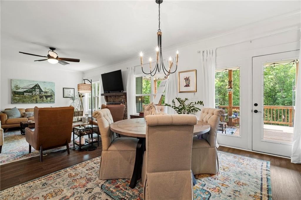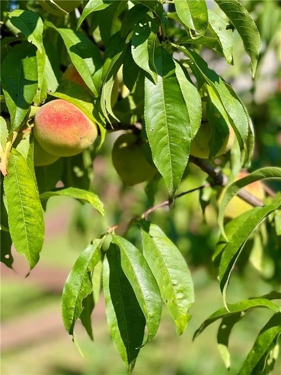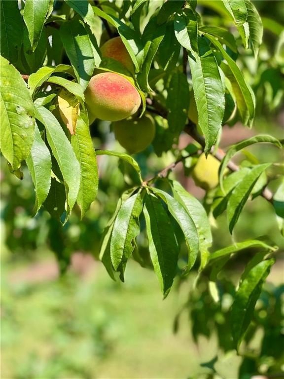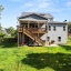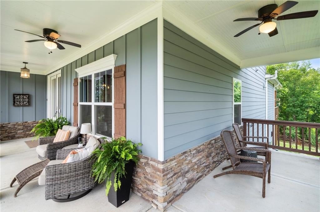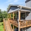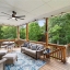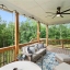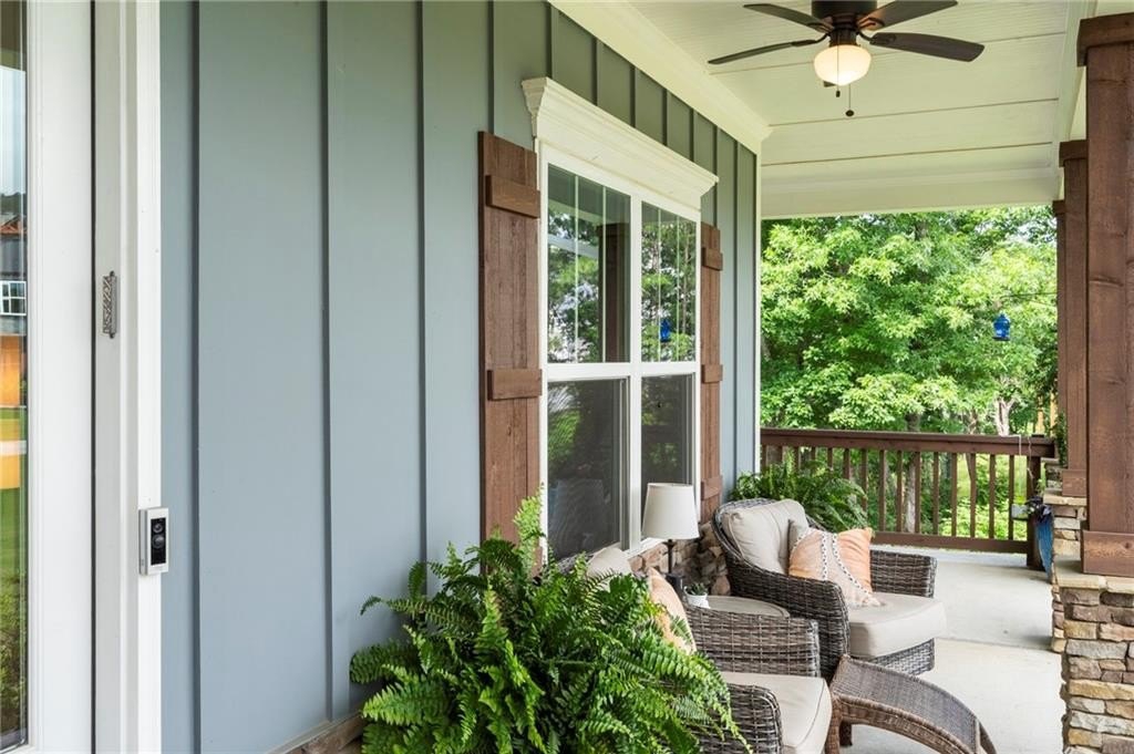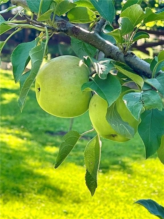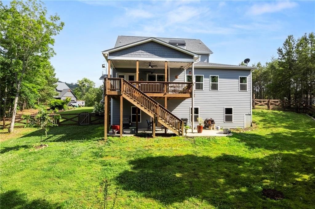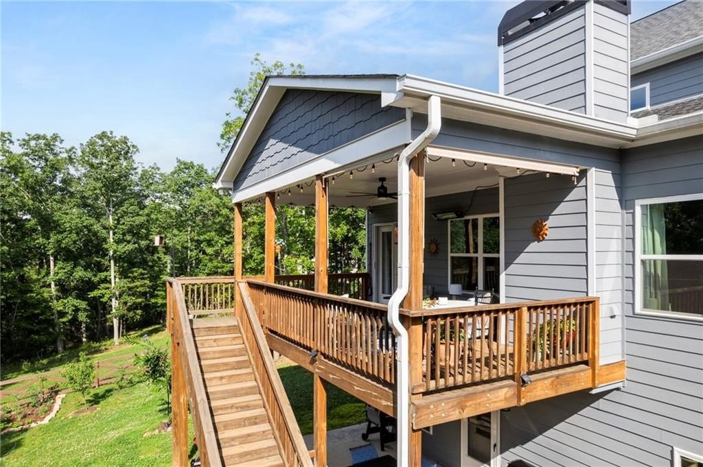 - Back porch overlooking fenced yard with fire pit and fruit trees