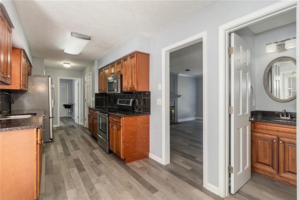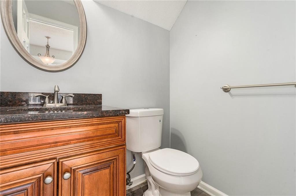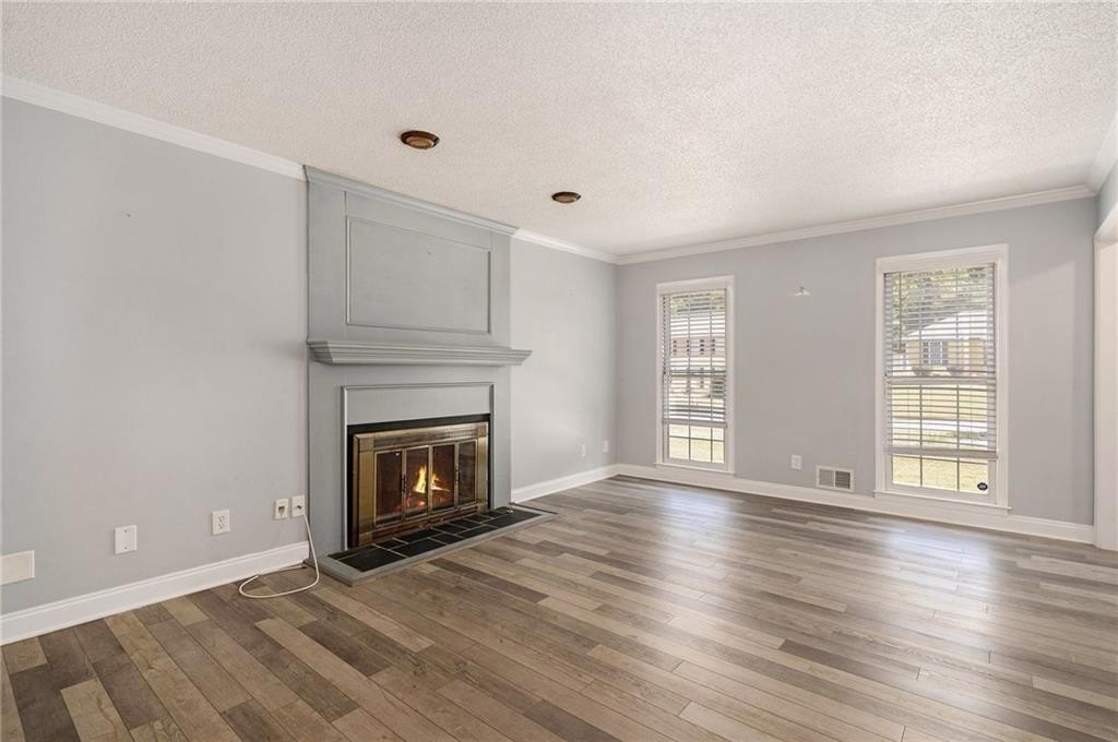 Inside, a spacious family room with a cozy fireplace provides the heart of the home, ideal for relaxing or entertaining. The main level also features a formal living room and a separate office, offering flexible spaces for work or gatherings. The kitchen is both functional and stylish, with stained cabinets, granite countertops, stainless steel appliances, and a view to the dining area, making meal prep a breeze.