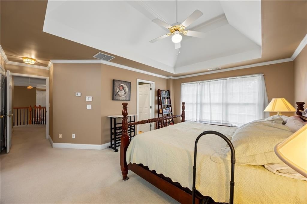 Upstairs, you’ll find a spacious laundry room for easy access and large secondary bedrooms that share a generous hall bath with double vanities. The primary suite is a true retreat with trey ceilings, a bright sitting area, and three closets. The master bath includes a large double vanity with abundant counterspace, a whirlpool tub, and a separate shower. The home’s thoughtful layout provides over 2,500 square feet of comfortable living space, with much of it rarely used and impeccably maintained.