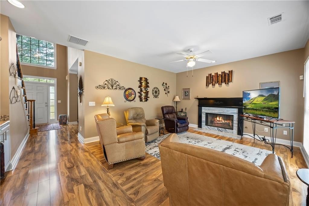 Welcome home to this beautifully maintained stone-front residence located in the highly sought-after Four Seasons on Lake Lanier community in South Hall. Nestled on a large, level lot with a side-entry garage and built-in cabinetry, this home offers exceptional space, style, and care throughout. Step inside the two-story foyer to find gleaming bamboo flooring on the main level, a formal living room and dining room, and a bright, open great room featuring a marble fireplace and wet bar. The eat-in kitchen has been completely updated with soft-close cabinetry, granite countertops, tile backsplash, and stainless steel appliances, all designed to blend everyday functionality with timeless appeal. A convenient half bath is also located on the main level.