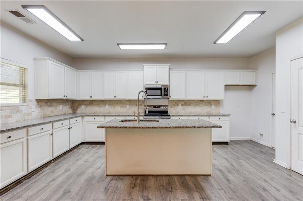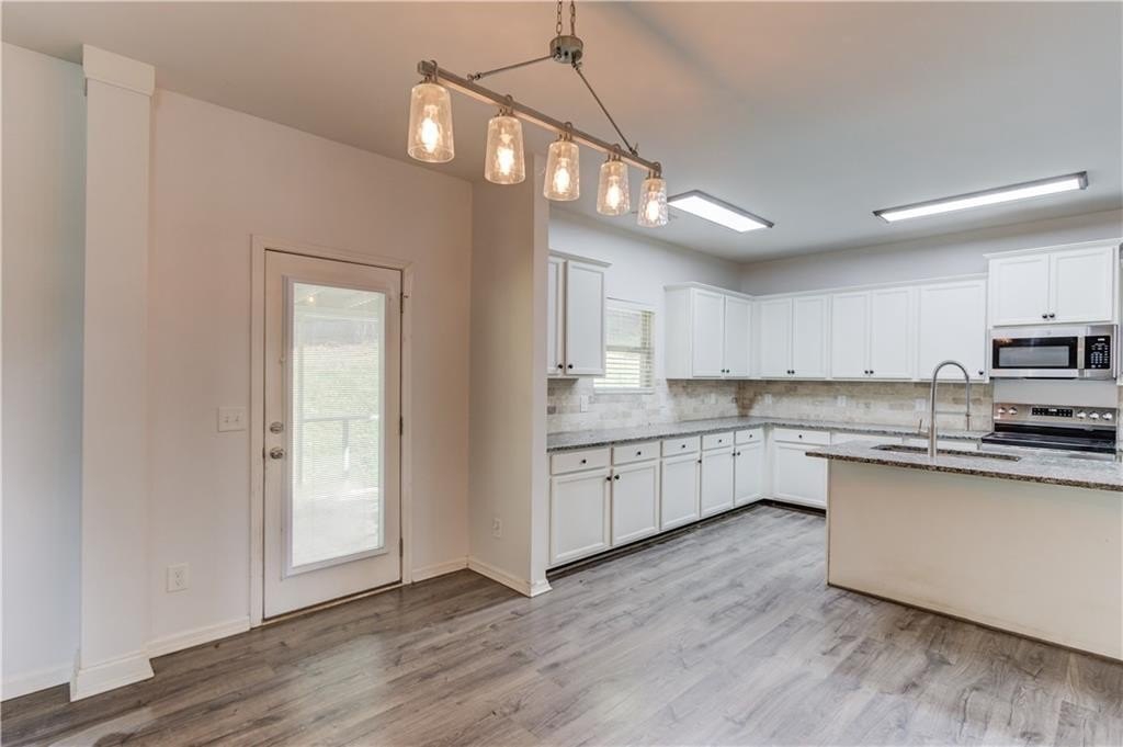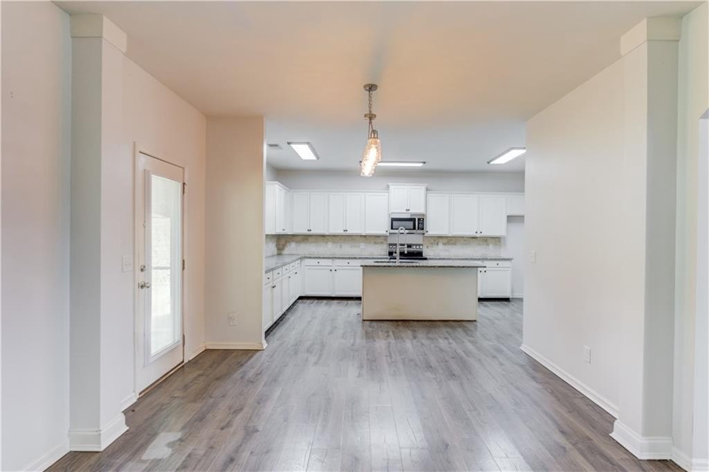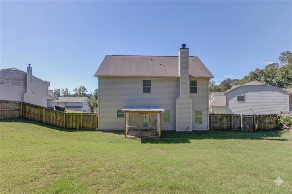 Welcome to this beautifully maintained 4 BDRM, 2.5 BATH home! Enjoy your morning coffee on the charming covered front porch before stepping inside to find luxury vinyl flooring and carpet throughout the home. The bright and inviting living room features plenty of natural light and a cozy fireplace, creating the perfect gathering space. The open-concept dining area offers access to the covered back porch and fenced backyard, ideal for entertaining or relaxing with a wooded view. The kitchen boasts white cabinetry with ample storage, stone countertops, stainless steel appliances, a breakfast bar, tile backsplash, pantry, and a large island for extra prep space. Upstairs, you’ll find all four spacious bedrooms. The primary suite offers high ceilings, walk-in closets, and a spa-like bathroom with a double vanity, soaking tub, separate shower, and large window for beautiful natural light. Located near GA-316, with shopping, dining, and schools just minutes away and best of all, no HOA!