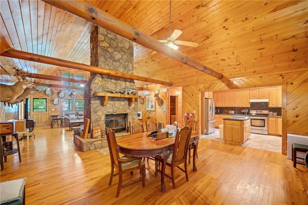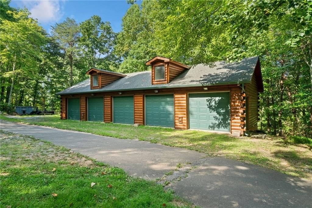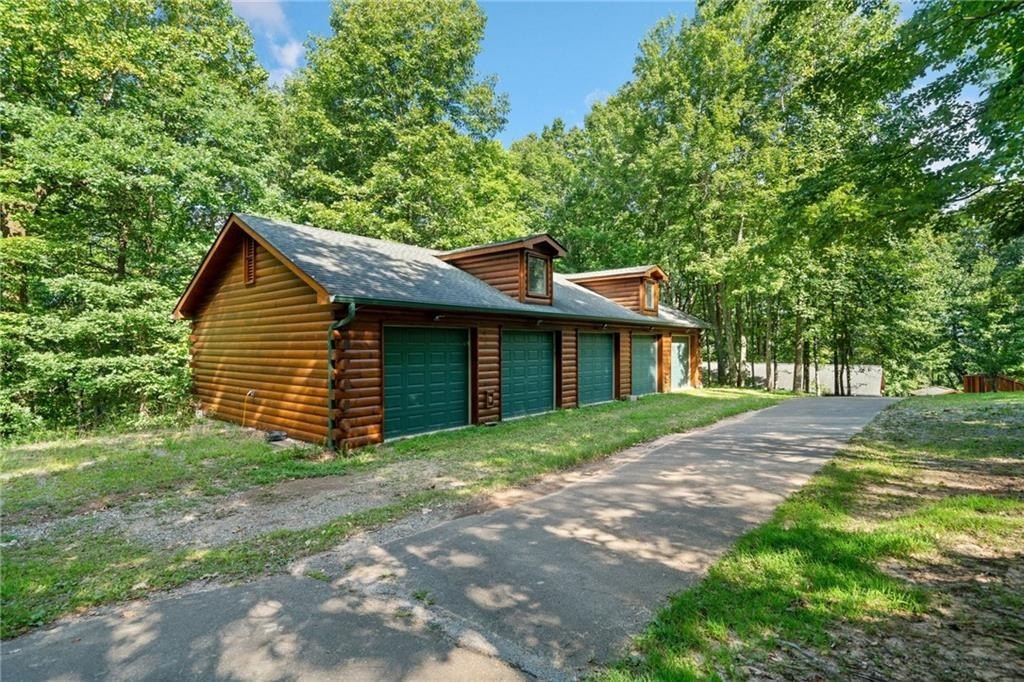 Step inside to find exposed beams and a masonry fireplace that sets center stage! Everything you need is on the main level. The spacious Primary Bedroom features oversized closets, and a luxurious ensuite bath. With 2 secondary bedrooms and a bathroom just down the hall. The open-concept kitchen, living and dining area is perfect for entertaining. Down into the basement you will find a full mother-in-law suite, complete with its own kitchen and separate entrance—ideal for guests or extended family. For car enthusiasts or those in need of ample storage, the property boasts an impressive array of garage space: a main-level two-car garage, a drive-under garage with room for three cars, a detached 5-bay garage, and an additional 2-bay garage with space for six more vehicles. There's even an outdoor storage shed for all your tools and equipment. Surrounded by mature trees and lush landscaping, this property offers tranquility and seclusion. And if you're looking for even more space, there's an option to purchase two adjoining 5-acre lots, bringing the total to a sprawling 18 acres.