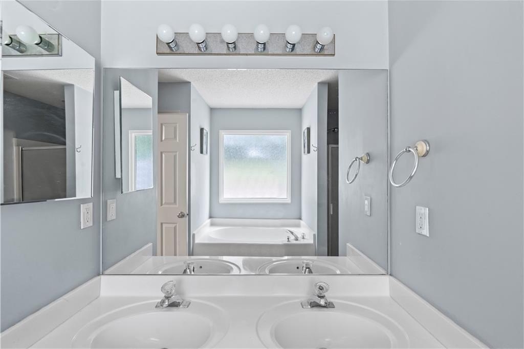 The main-level primary suite is a true retreat with soaring tray ceiling, a generous walk-in closet, and a spa-inspired bath featuring dual sinks, a soaking tub, a separate shower, and a private water closet. Upstairs, a private retreat awaits with a large bedroom, full bath, and walk-in closet, offering incredible flexibility for guests, teens, or multi-generational living.