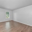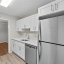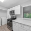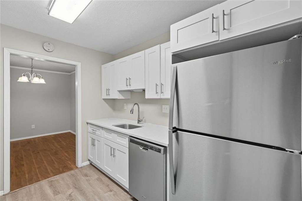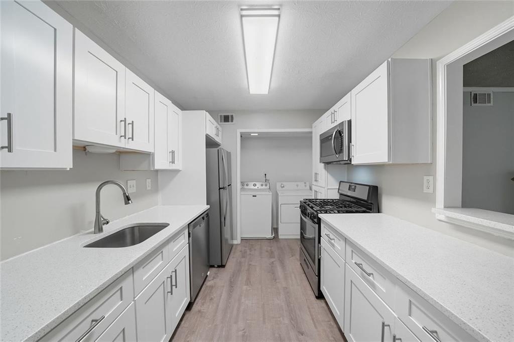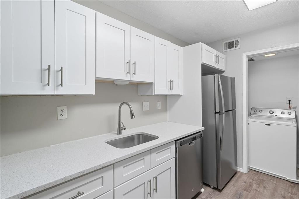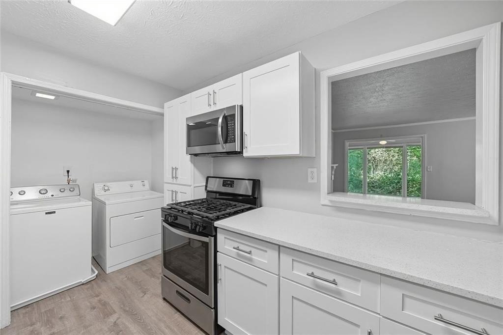 The kitchen is crisp and updated with quartz countertops, newer cabinetry, and new flooring that continues throughout the home—no carpet, no hassle.