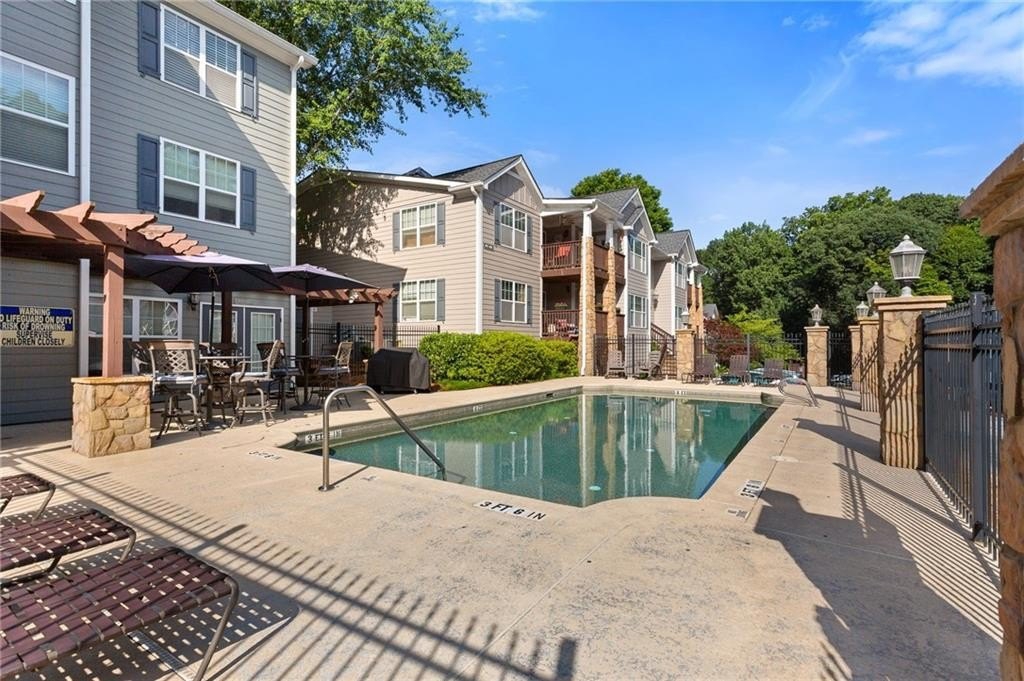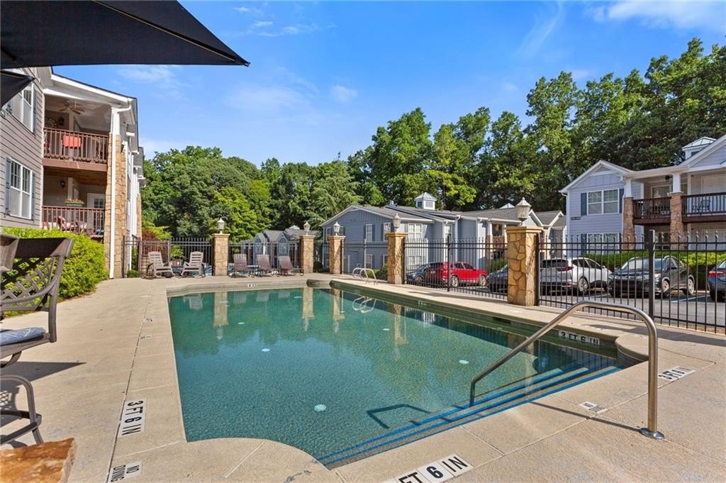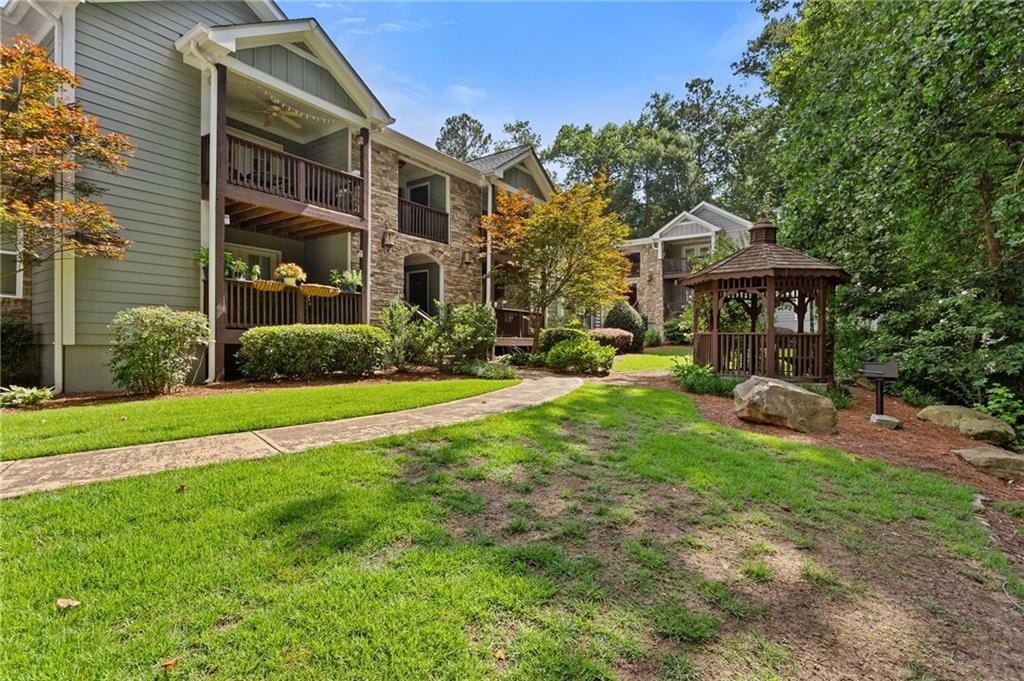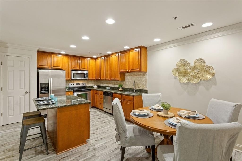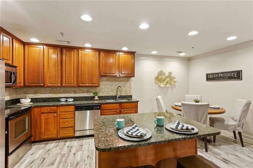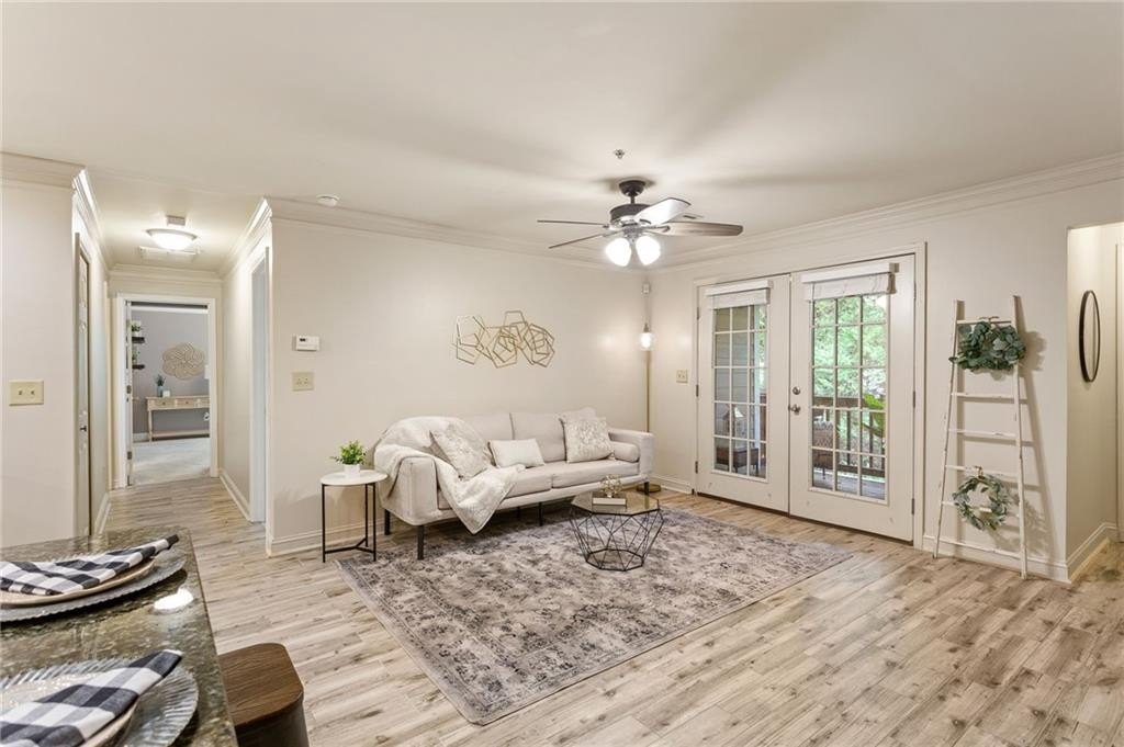 Welcome to nearly maintenance-free, single-story living in the heart of Smyrna! This beautifully maintained 2-bed, 2-bath end-unit condo spans 1,151 sq ft and welcomes you with luxury vinyl flooring, recessed lighting, crown molding, and ceiling fans throughout. French doors off the family room reveal a private balcony, perfect for your morning coffee spot or intimate evening retreat. The kitchen is chef-ready with ample stained cabinets, stone-tile backsplash, granite countertops, an island, and sleek stainless steel appliances. Both spacious bedrooms feature walk-in closets and full baths for comfort and privacy. The Madison at Village Green is a great community, offering a sparkling swimming pool, a clubhouse, sidewalks and trails, gazebos and grilling areas, a dog park, and a fitness center. This is all included in a central Smyrna location with easy access to Smyrna Market Village, the Silver Comet Trail, several local parks and nature trails, the interstate, and numerous nearby shopping, dining, and entertainment options. Perfect for professionals, downsizers, or anyone seeking Smyrna's vibrant community with a relaxed retreat. Don’t miss it!