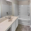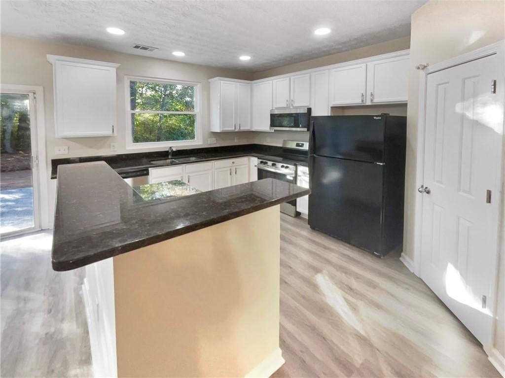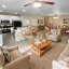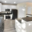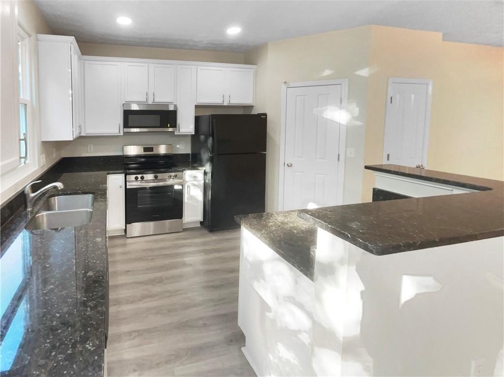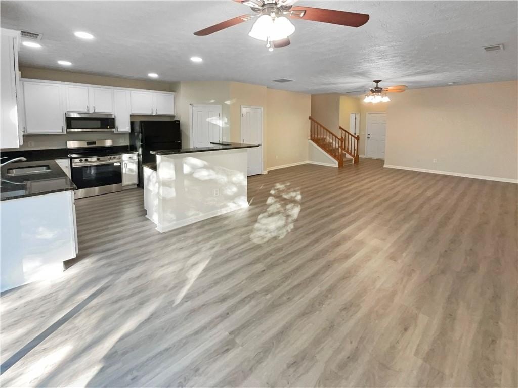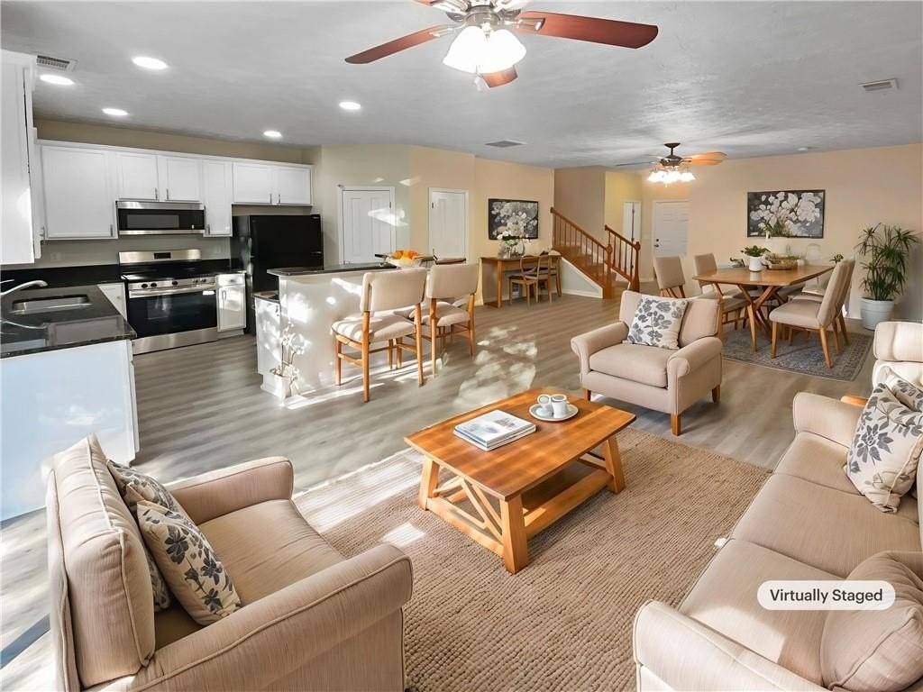 kitchen boasts white cabinets, granite countertops, a breakfast bar, and plenty of storage, all overlooking the main living space for easy interaction.