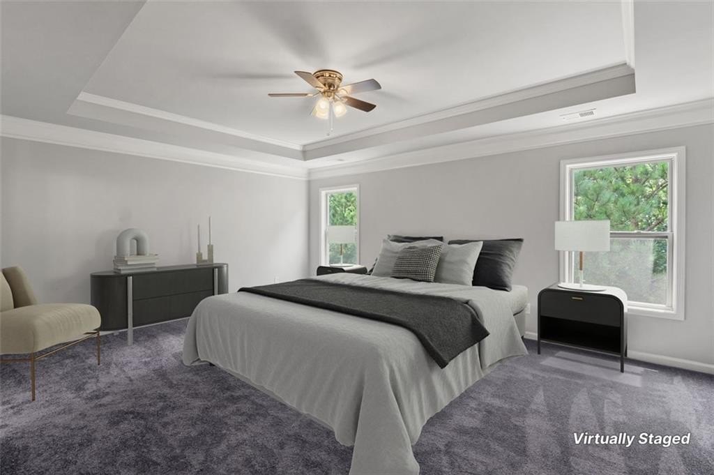 The massive master suite is a true retreat, complete with its own private sitting room, creating the perfect space to unwind. The spa-inspired master bathroom features double vanities, a soaking tub, separate glass shower, a private toilet room, and an expansive walk-in closet that feels like an additional bedroom.