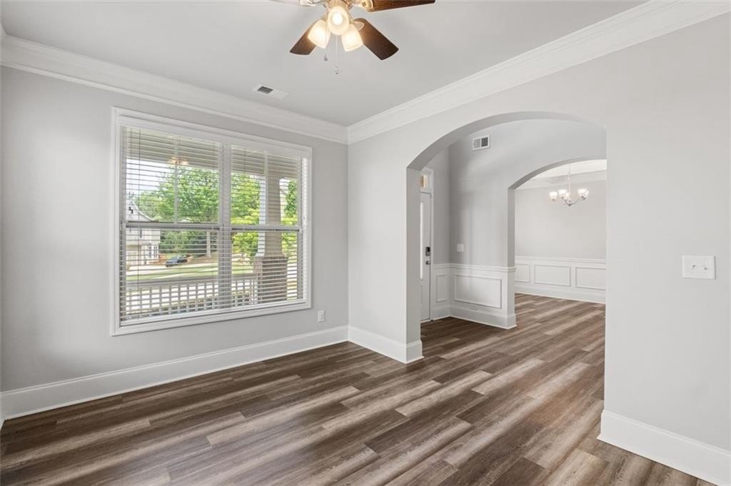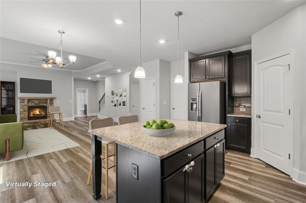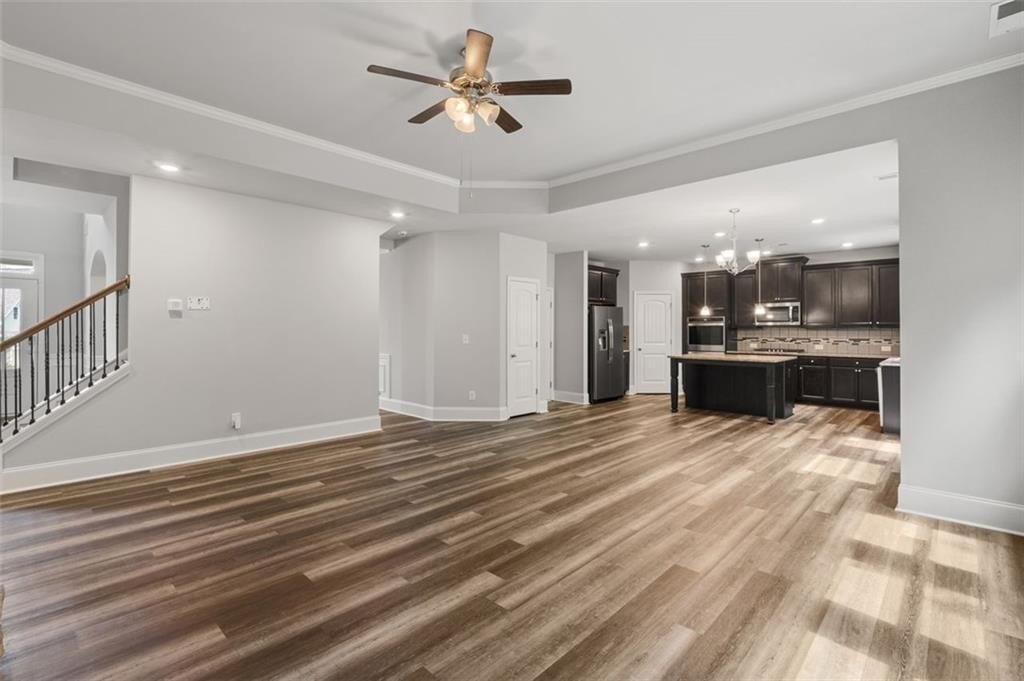 Step inside to a grand two-story foyer with a dramatic catwalk overlook that creates an immediate sense of space and elegance. The main level features a bright open layout where the gourmet kitchen flows seamlessly into the family room, perfect for entertaining and everyday living. You’ll also find a formal dining room, a separate formal living room, and plenty of sunlight pouring in through large windows throughout.