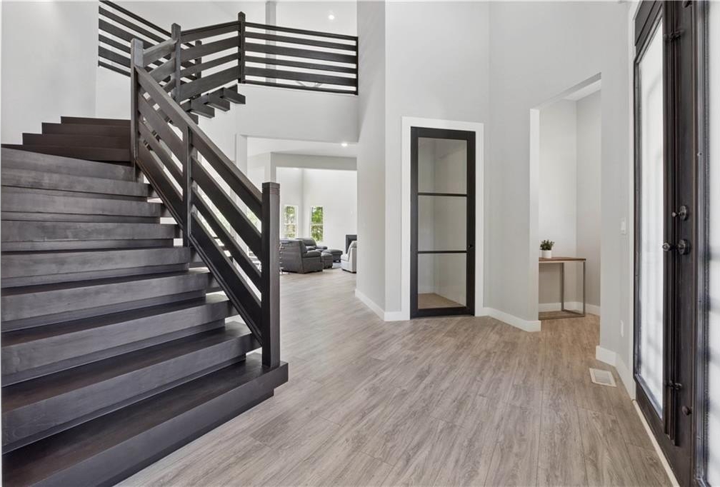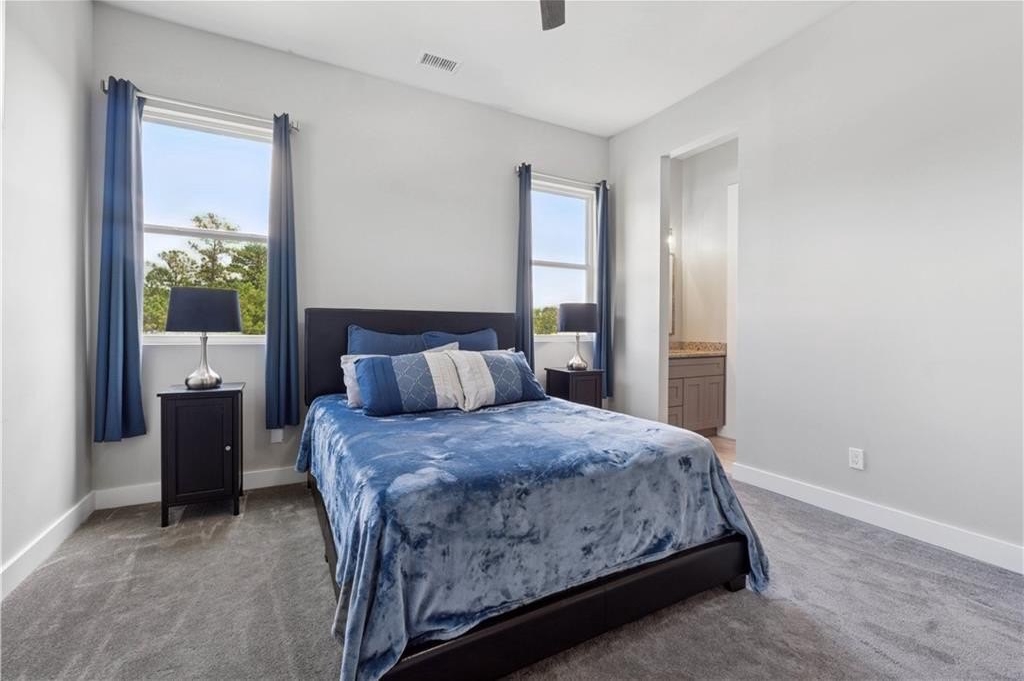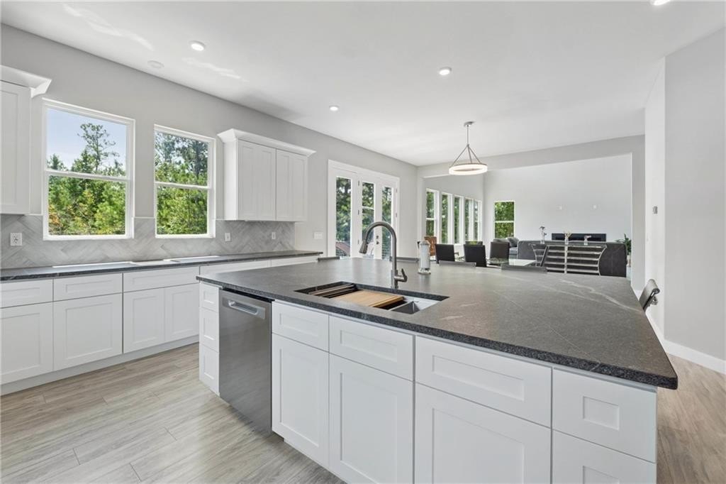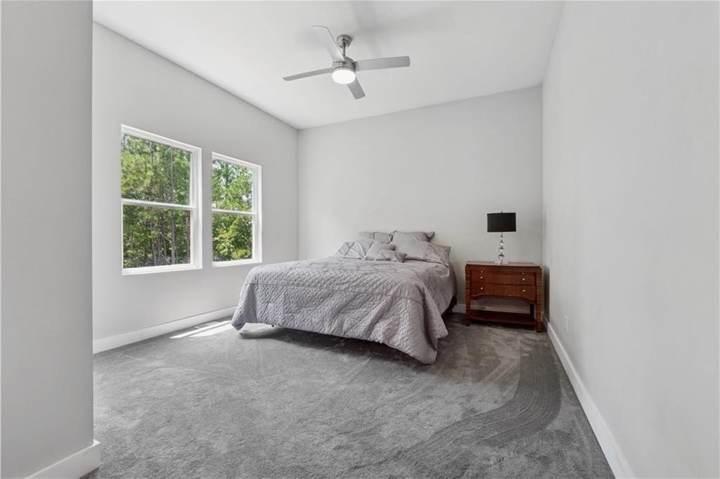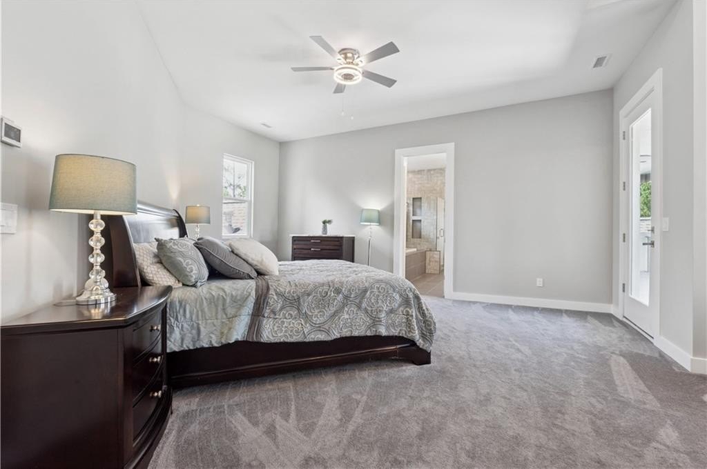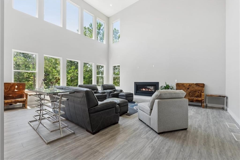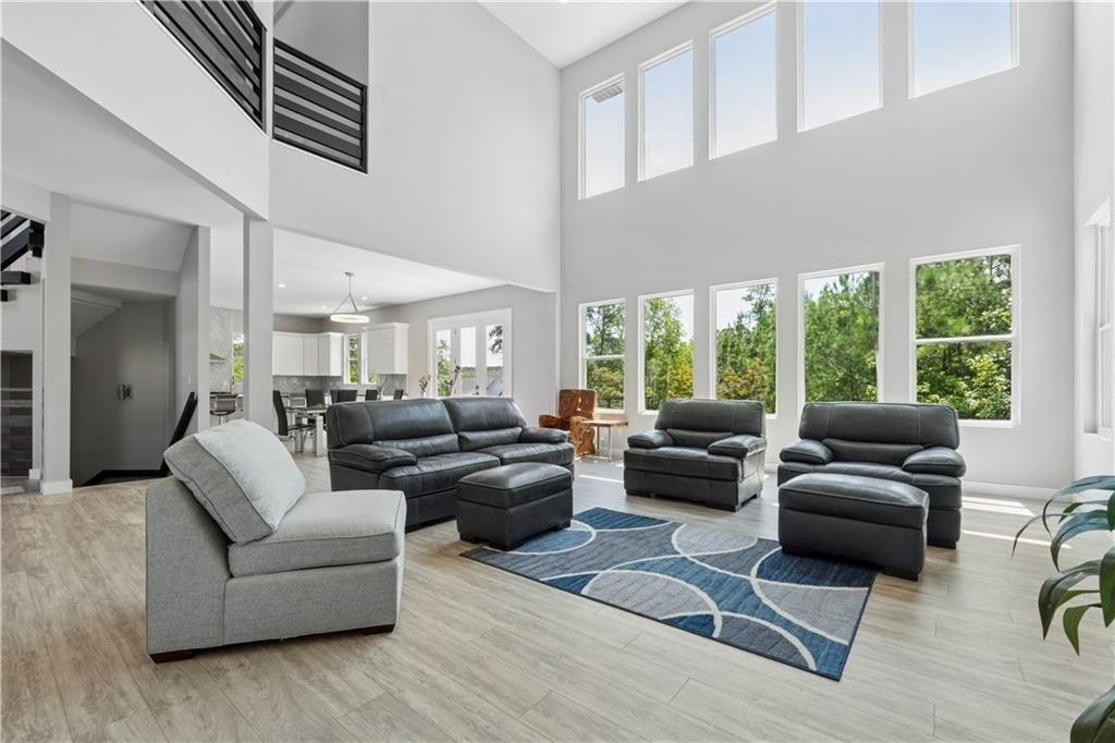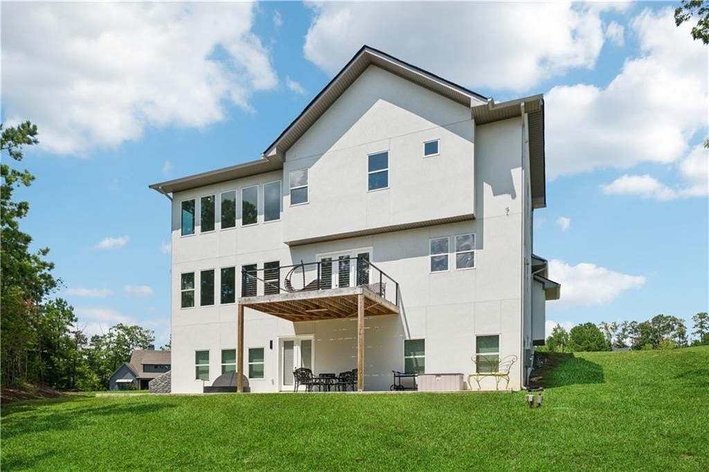 Don't Miss the Opportunity to Own a Stunning Contemporary Home situated on a corner lot in a golf course community in the prestigious Arbor Springs subdivision. Enter into the large foyer through a beautiful iron and glass front door, when you step inside you will be greeted to a large foyer with a soaring ceiling and custom staircase. Throughout the home are high ceilings and 8-ft doors. The main floor consists of a formal living area which can be utilized to meet the needs of your family as a 2nd family room, office or flex space. The large gourmet kitchen with expansive island has beautiful leathered granite countertops, 48-inch cook top, double oven, contemporary 48-in range hood, microwave with convection bake and air fryer, dishwasher, a great size walk in pantry, two designer sinks with multiple features and an abundance of quality cabinetry. Off the open concept kitchen is a dining area with full view of the family room; enjoy relaxing on the deck off the dining area. The family room has a soaring ceiling and features a contemporary fireplace. Additionally on the main floor and ensuring privacy and comfort for guest you will find a privately situated generous guest suite with ensuite, mudroom with ample drop space and storage cabinets, coat closet and spacious laundry room with sink and ample storage cabinets. The second floor consists of two generous sized secondary bedrooms with large walk-in closets, a bathroom with two private vanities serving each of the bedrooms and the primary suite. The large primary suite as a retreat and large walk-in closet. Enjoy your favorite morning or evening beverage on the large private balcony. Just steps away is the luxurious spa inspired primary ensuite. Relaxing is easy with the luxury shower tower and elegant whirlpool jetted tub with 31 hydro-therapeutic massage air jets for a soothing total body aero-therapeutic massage, the tub is also equipped with ergonomically-molded seating space for two adults, comfortable armrests located on both sides of the tub and heater to ensure the water maintains your desired temperature provides the luxury and comfort desired in a primary bath suite. All bedrooms are thoughtfully situated for privacy and quietness with no adjoining bedroom walls. The home would not be complete without the convenience of the perfectly situated 3-stop elevator shaft. Additionally, there is an oversized 3-car garage with a one of a kind private attached 2-story flex space with water line for sink/coffee bar can be great for a private office/crafts or endless possibilities; no need to climb attic stairs storage or use the garage for storage or lawn tools, the lower level of the flex space provides ample space for all your storage needs/golf cart space and has a double door exterior access leading to a slanted concrete slab for convenient exit and entry. The unfinished terrace level is framed for 8ft doors, is plumbed and awaiting your special touch. The community consists of a swimming pool, two lakes, sidewalks, tennis/pickleball courts, park and play ground. Without leaving the community and just a golf cart ride away at the main entrance enjoy the convenience of the Arbor Spring Plaza with Publix Supermarket, restaurants, salon, dentist office and space for many other future retailers and restaurants. Located in the sought after Northgate school district. The home is minutes from the Ashley Park shopping area, Newnan Pavilion, movie studios and the Hartsfield Jackson International Airport. Owner is Listing Agent