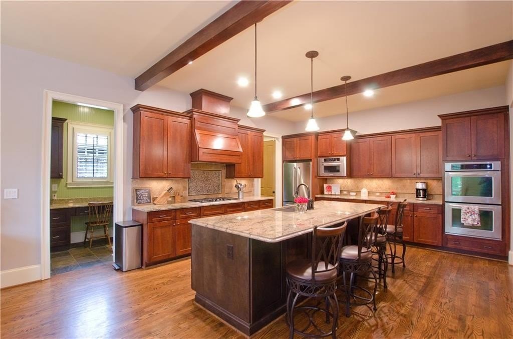 At the heart of the home is a chefs dream kitchen featuring stainless steel appliances, double ovens, stained cabinetry, granite countertops, a large center island, and a generous walk-in pantry. The kitchen flows seamlessly into the impressive great room, complete with exposed wood beams, a striking stone fireplace with gas logs, custom built-ins bookcases, a wall of windows and a wet bar with a wine cooler.