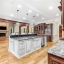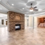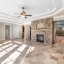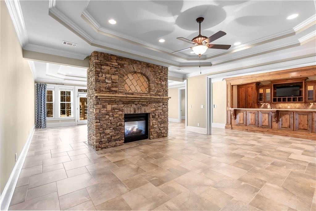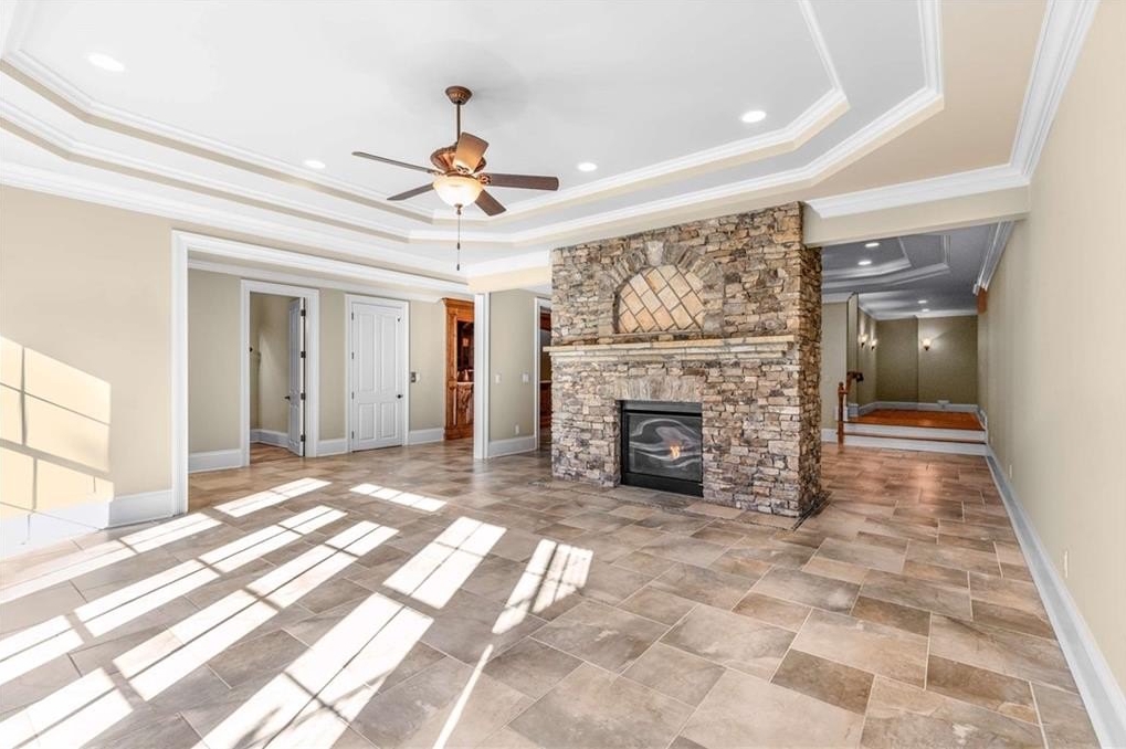 The heart of the home centers around a soaring two-story great room with a limestone fireplace, flowing effortlessly into the chef’s kitchen — outfitted with custom cabinetry, Dacor 6-burner range, dual ovens, commercial-grade refrigerator/freezer, and a grand stone-topped island. The adjoining keeping room with its own fireplace and generous breakfast area provides an inviting space for everyday living.