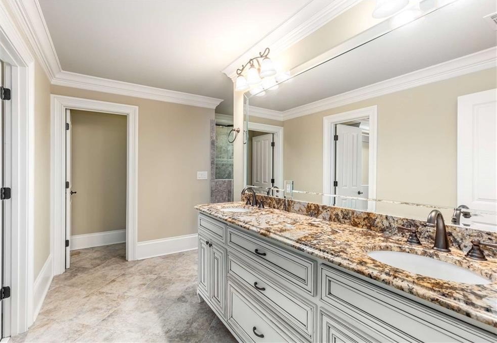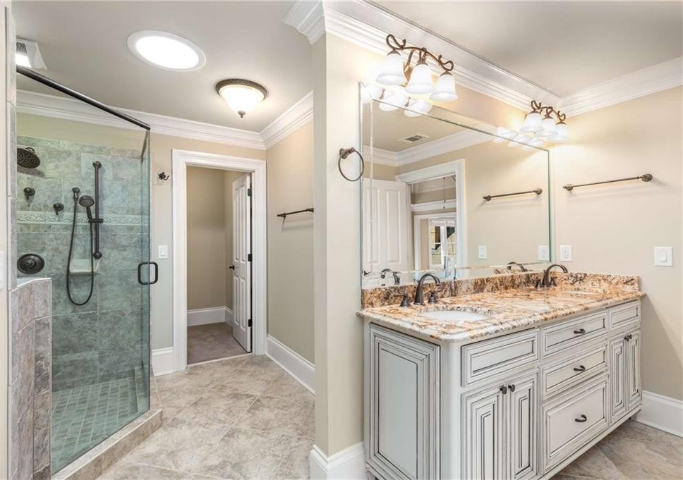 Main-Level Primary Suite: Spa-like retreat with jetted tub, dual vanities, towel warmer, walk-in shower, and custom his-and-hers closets.