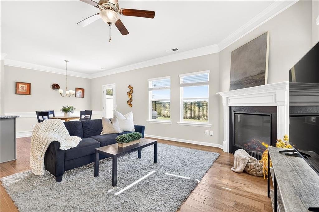 Step inside to find an inviting open floor plan featuring 5” hardwood floors, a spacious kitchen with granite countertops, a large island, recessed lighting, and a walk-in pantry. The family room boasts oversized windows, crown molding, and a cozy fireplace, filling the space with natural light.