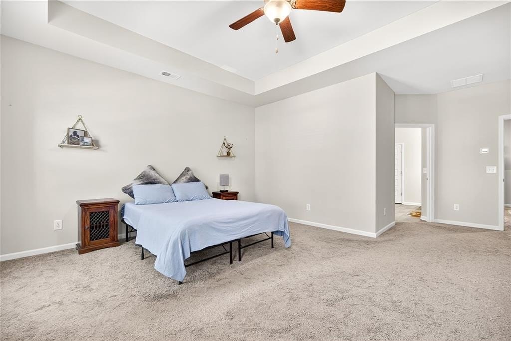 Upstairs, the luxurious master suite includes tray ceilings, a spacious walk-in closet, and a spa-like bathroom with dual vanities, a walk-in shower, and private water closet. Two additional bedrooms share a full bath, and a central upstairs walk-in laundry room adds convenience.