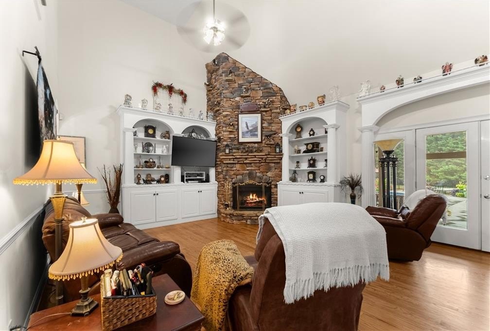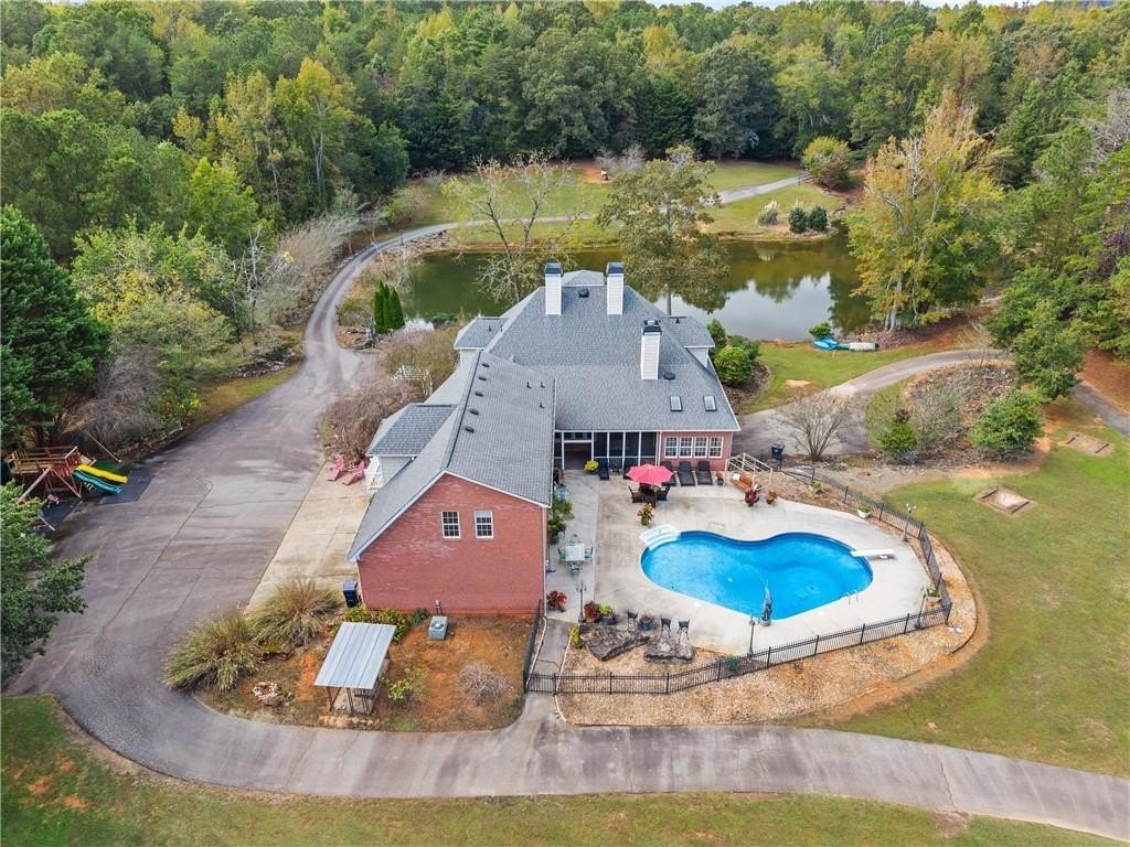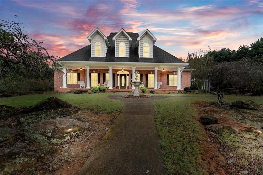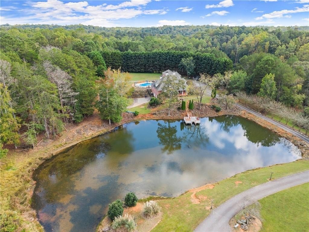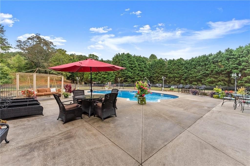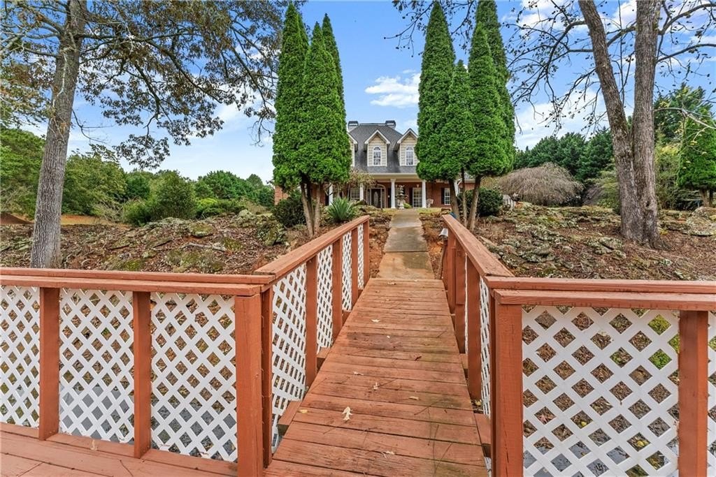 First time on the market! This one-owner Gainesville estate sits on 10 private acres with a picturesque half acre pond, a long private gated drive, and a beautiful saltwater pool. The pool has a diving board, dolphin fountain, and black iron fencing surrounding it. Inside, you’ll find oak floors, a dramatic two-story living room with a floor-to-ceiling stone fireplace, a separate keeping room and a bright covered patio off the large open kitchen. The main level includes an office, the primary suite, and two secondary bedrooms with their own private baths. The primary suite boast vaulted ceilings, dual closets, a large private bathroom with his and hers vanities and separate tub and shower. Upstairs offers two extra large bedrooms with their own bathrooms and walk in closets. The finished basement includes a theater room, two flex rooms with closets, a full bathroom, plenty of storage space and dual one-car garages. Above the main level three car garage you will find an apartment featuring a full kitchen of its own, two bedrooms, one bathroom, laundry, and balcony—perfect for guests or income potential. The property also includes a building with three horse stalls and oversized bays for boats or RVs. There are also beautiful peach trees, apple trees and blueberry bushes on the property.