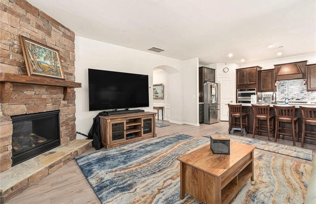The heart of the home is a gourmet kitchen featuring a large center island, ideal for casual dining and hosting, open to the dining area and a spacious gathering room with a stunning fireplace. Just off the dining area, a bright and airy sunroom provides a relaxing space for morning coffee or entertaining guests.