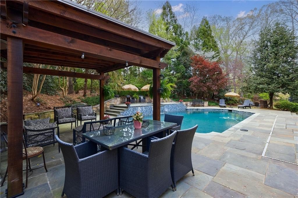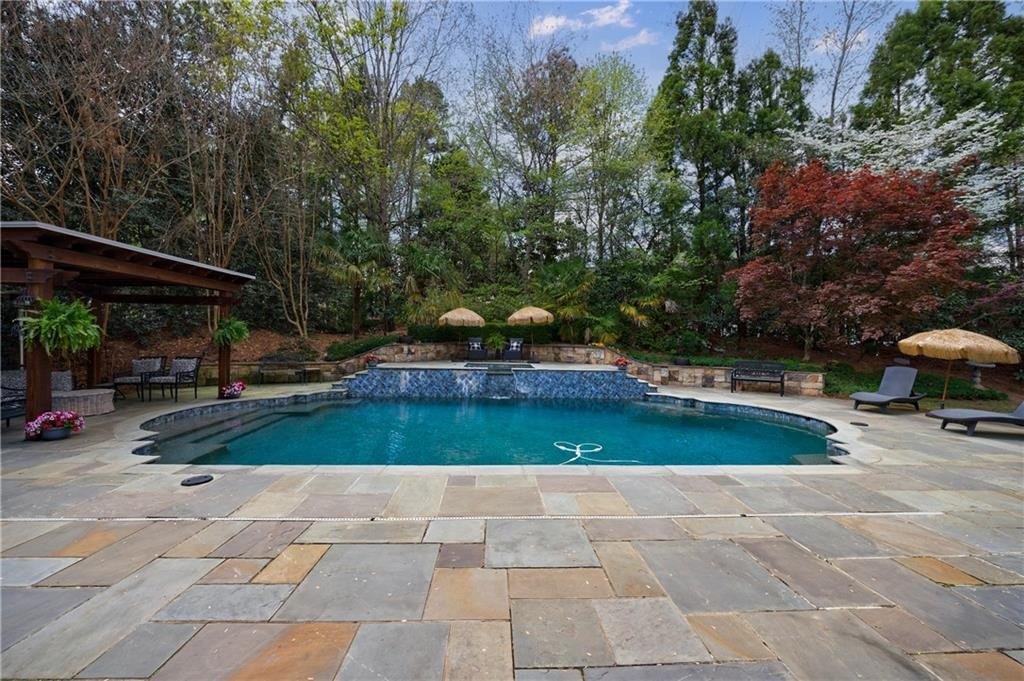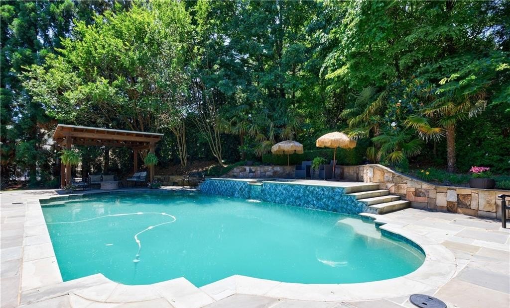 Discover this exceptional estate home in the prestigious COUNTRY CLUB of the SOUTH, offering a luxurious walkout pool and spa directly from the main level. The secluded backyard oasis features a waterfall spillover from the elevated hot tub spa, ample green space for outdoor games, and a charming gazebo cabana perfect for shaded relaxation and outdoor entertainment. The pool surround features blue stone slate creating beautiful setting.