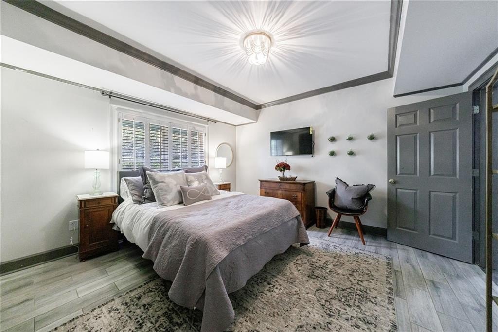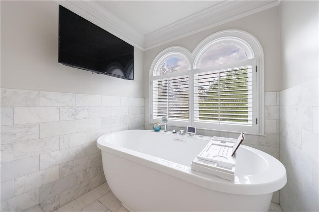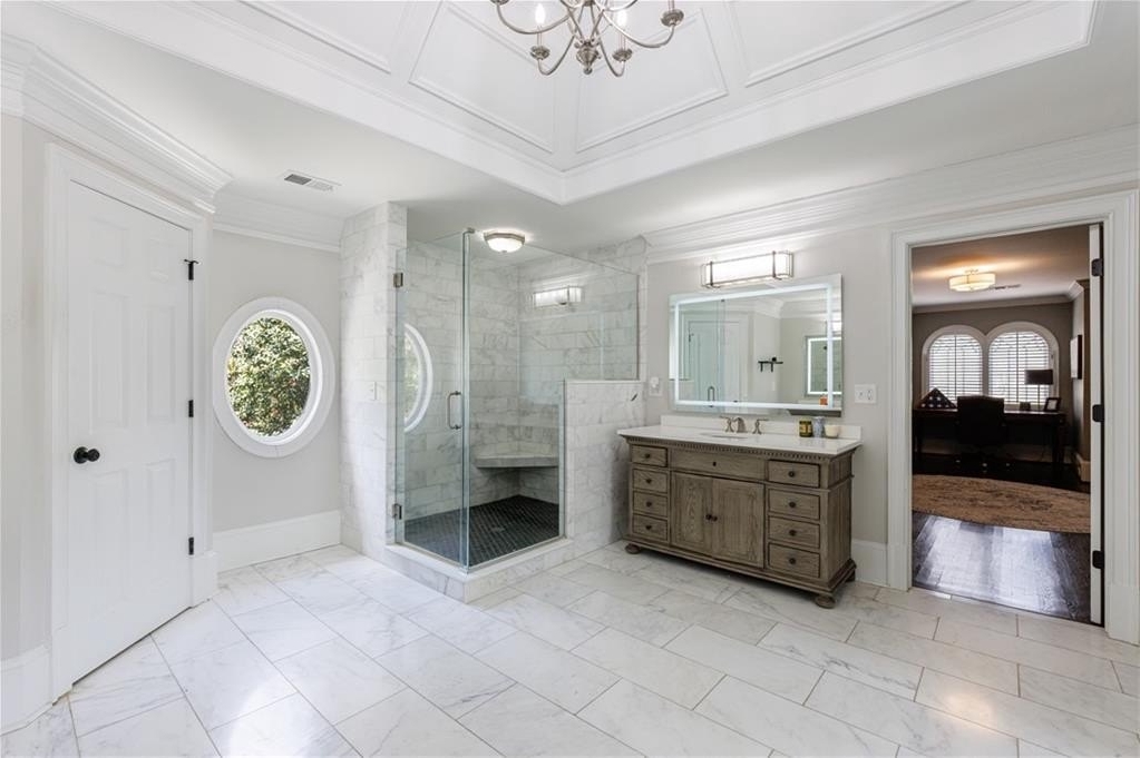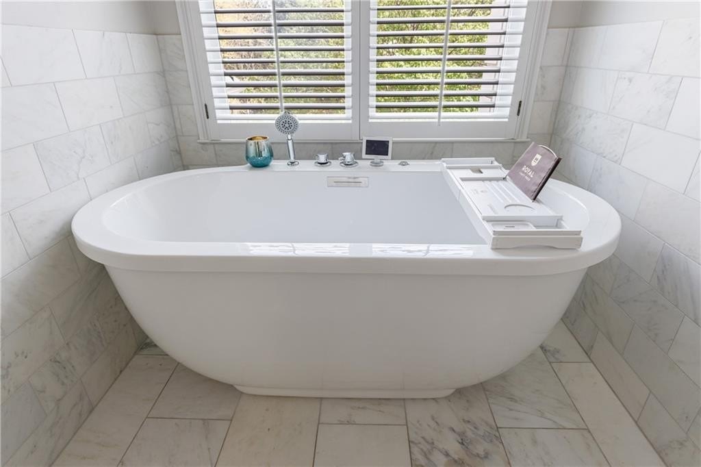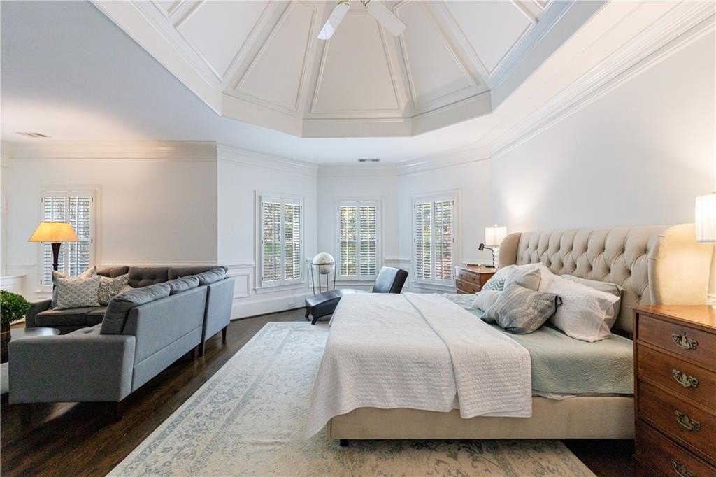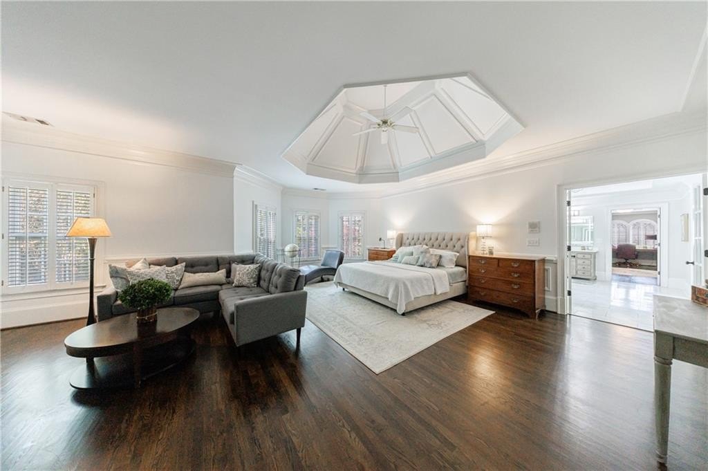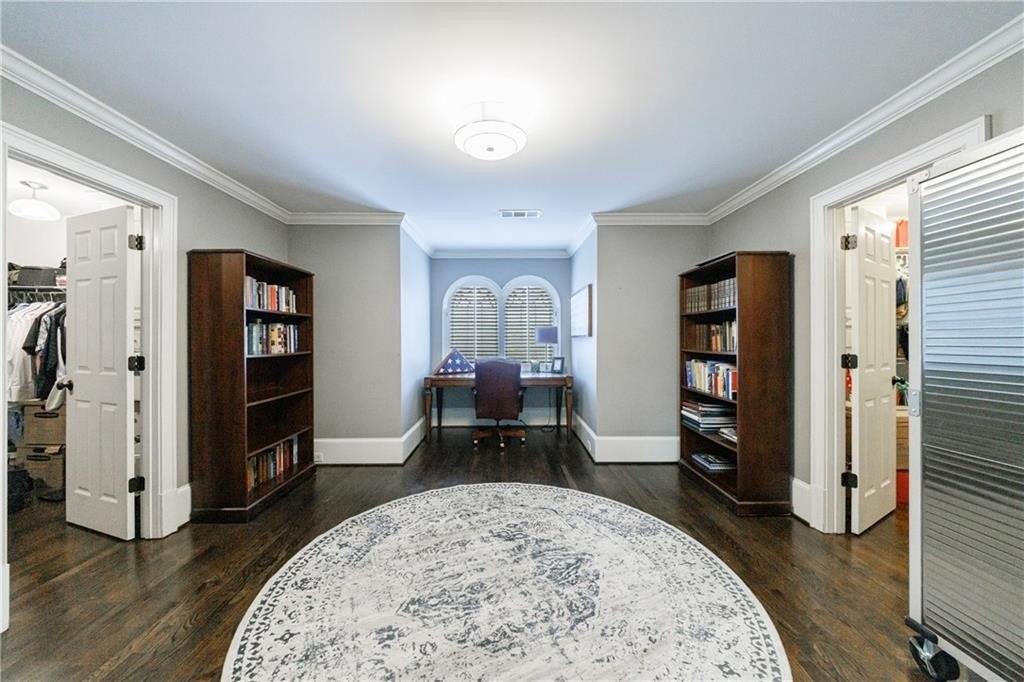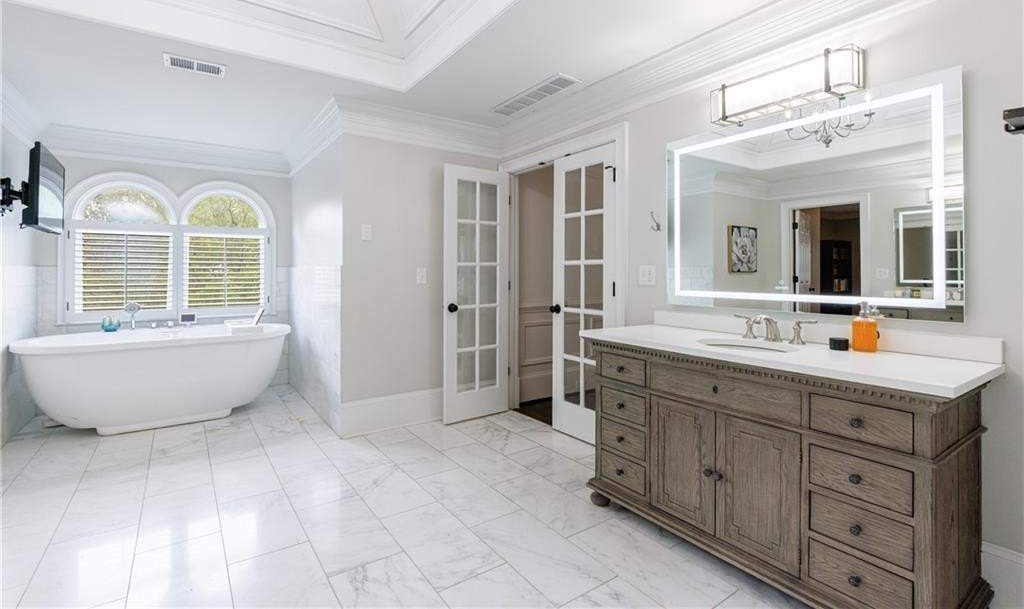 The upper-level primary suite is a true retreat, featuring a sitting area with a cozy fireplace, a wall of windows, and an updated spa-like bath with a stand-alone soaking tub. The suite includes a massive flex space room, two independent walk-in closets, and a third walk-in closet complete with a built-in desk.
