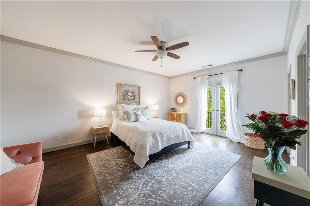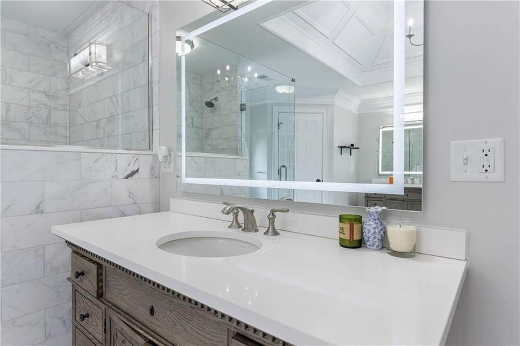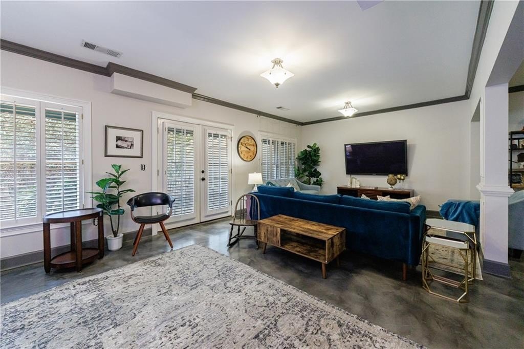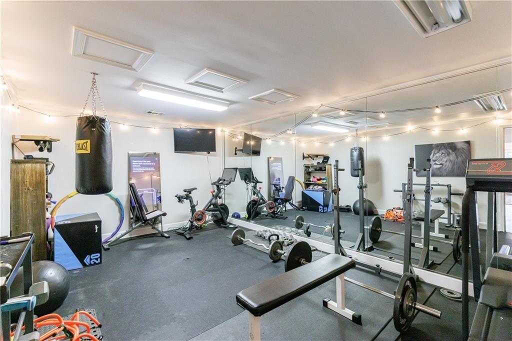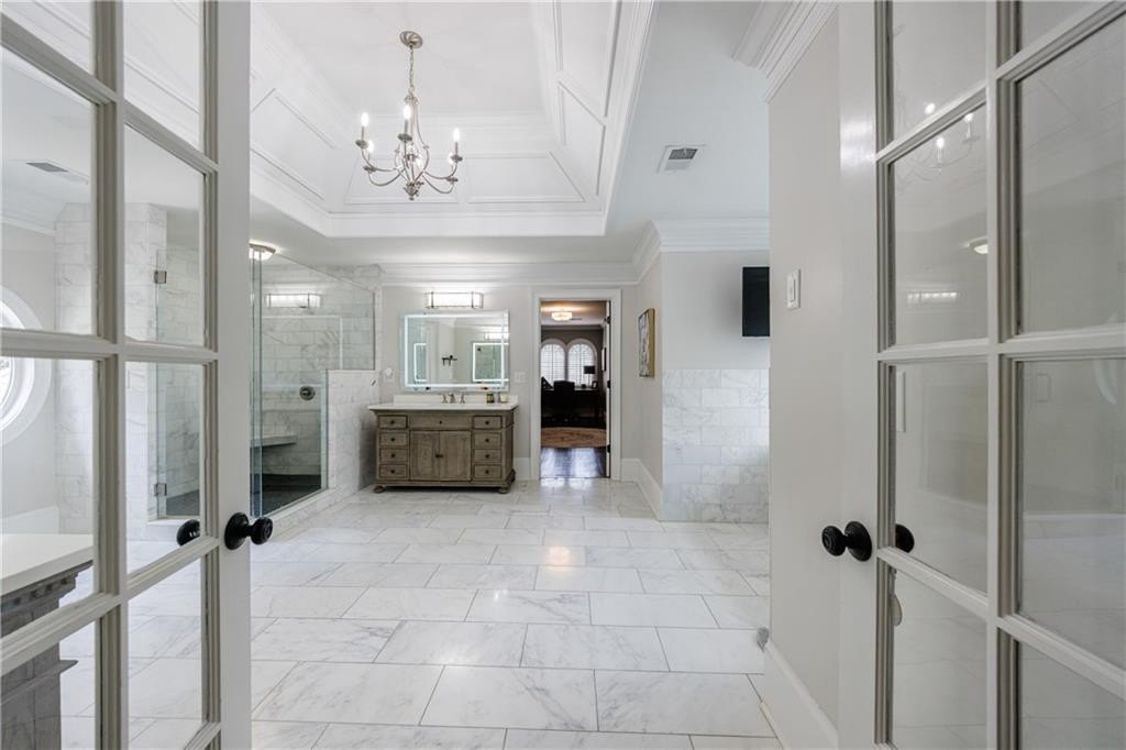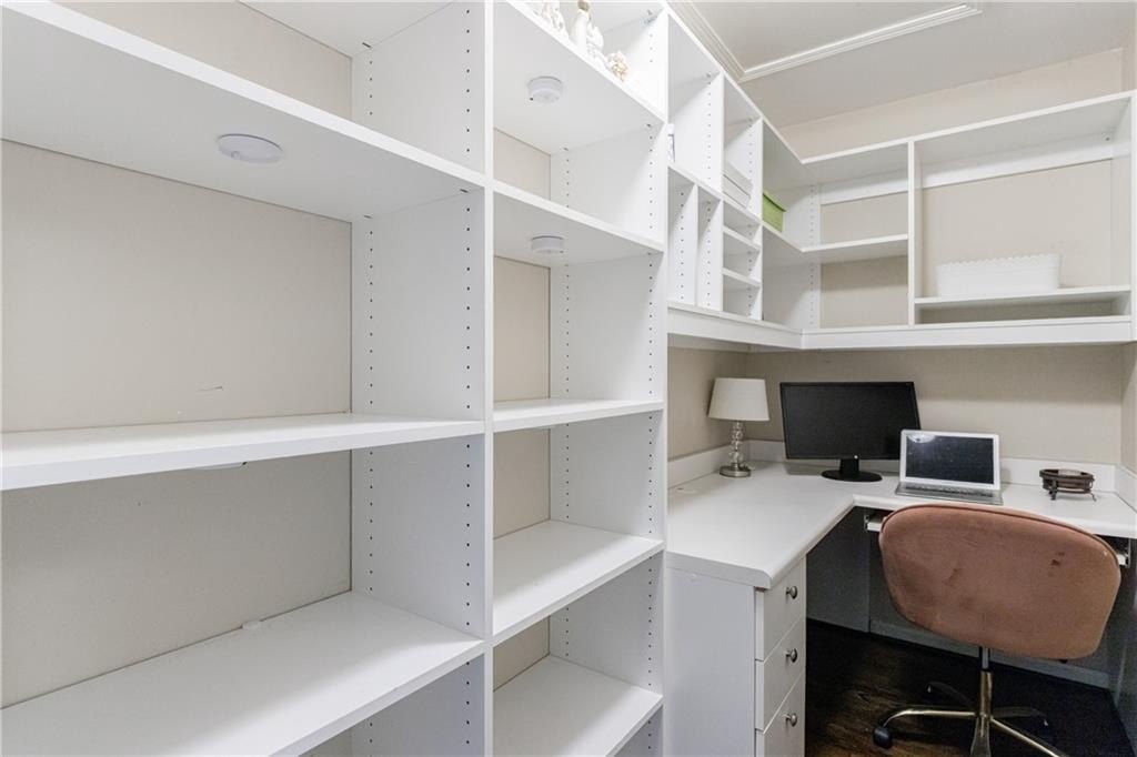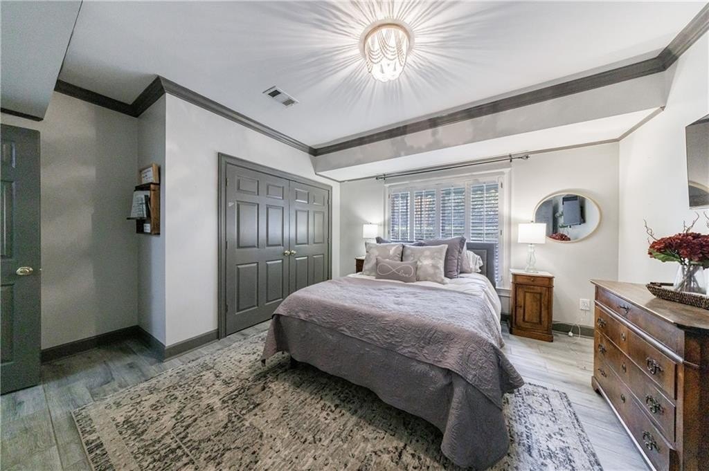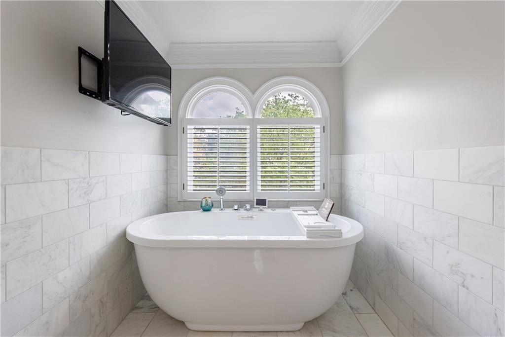 The upper-level primary suite is a true retreat, featuring a sitting area with a cozy fireplace, a wall of windows, and an updated spa-like bath with a stand-alone soaking tub. The suite includes a massive flex space room, two independent walk-in closets, and a third walk-in closet complete with a built-in desk.