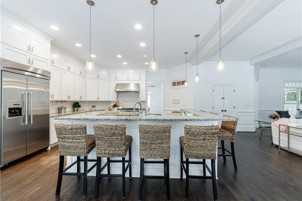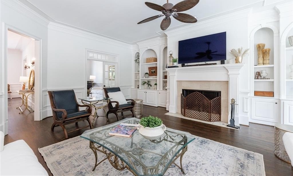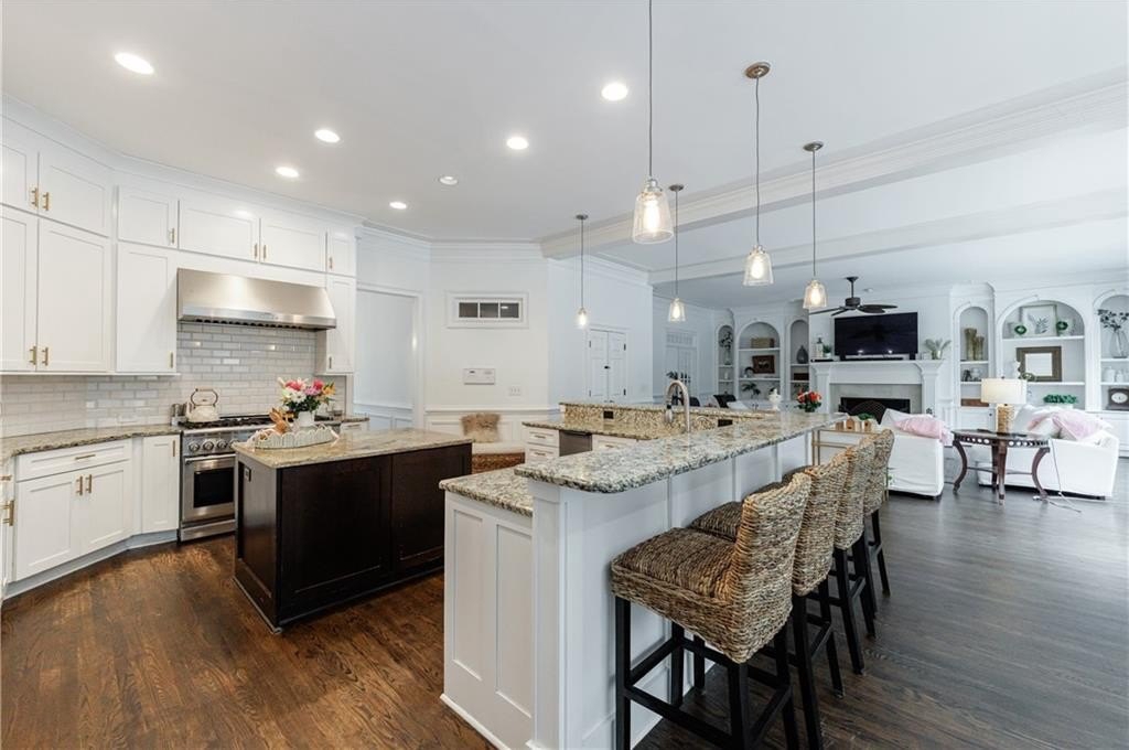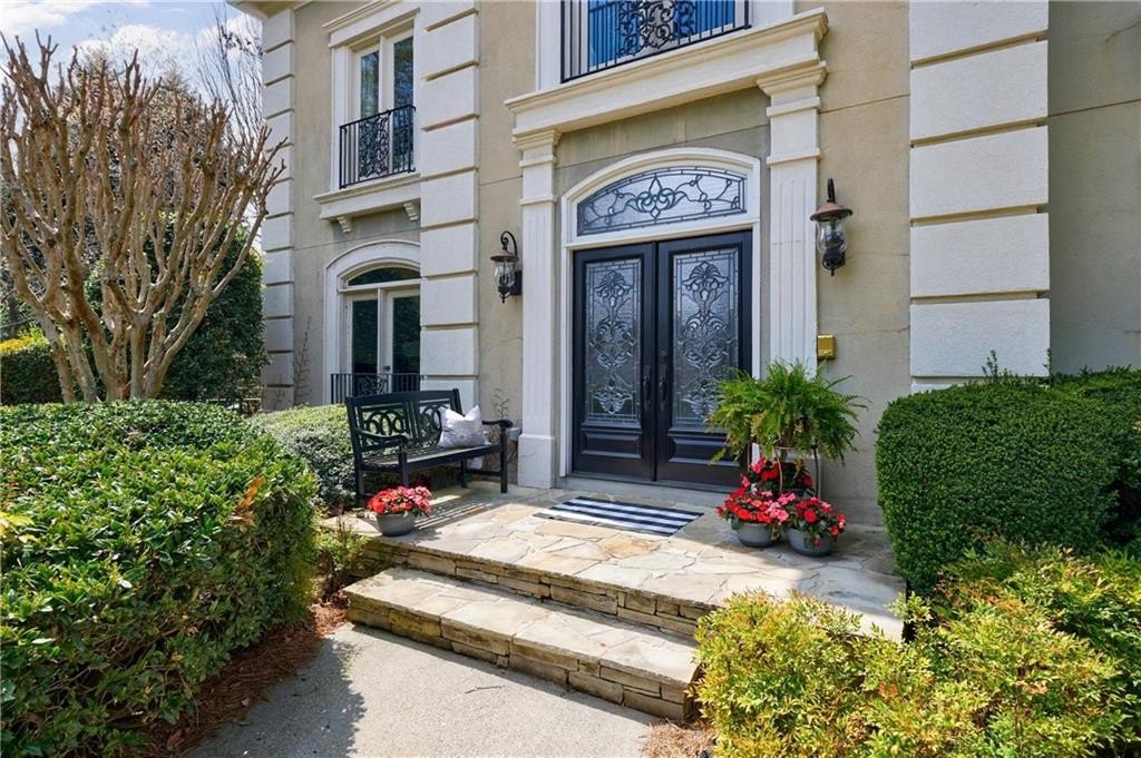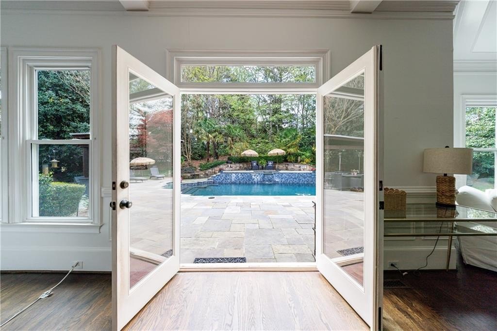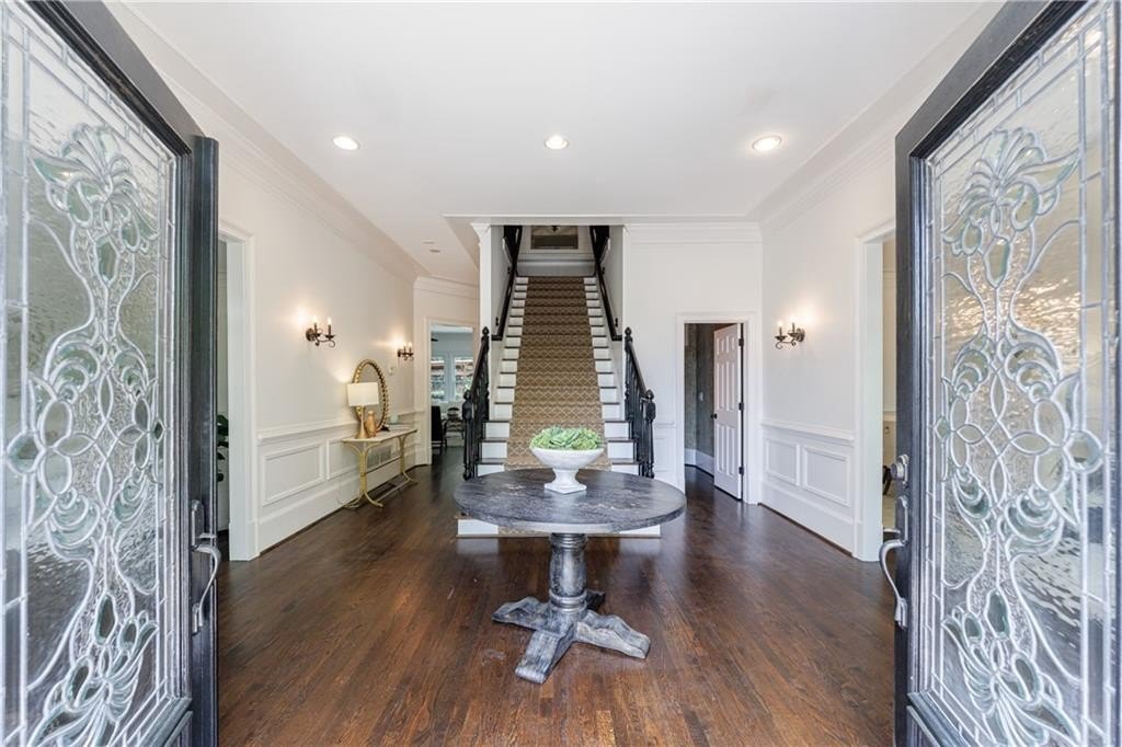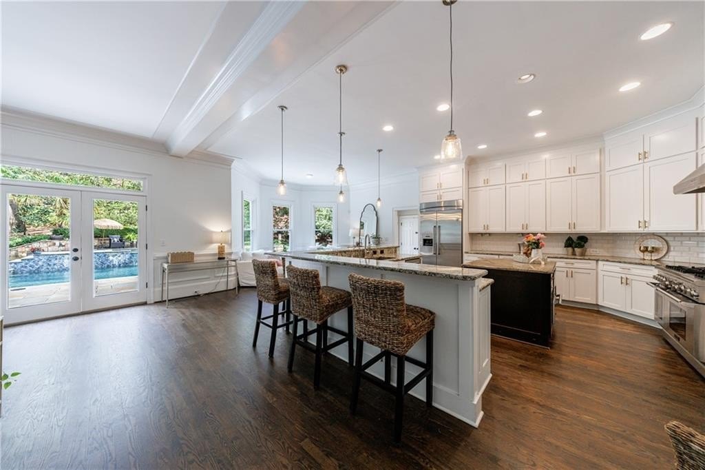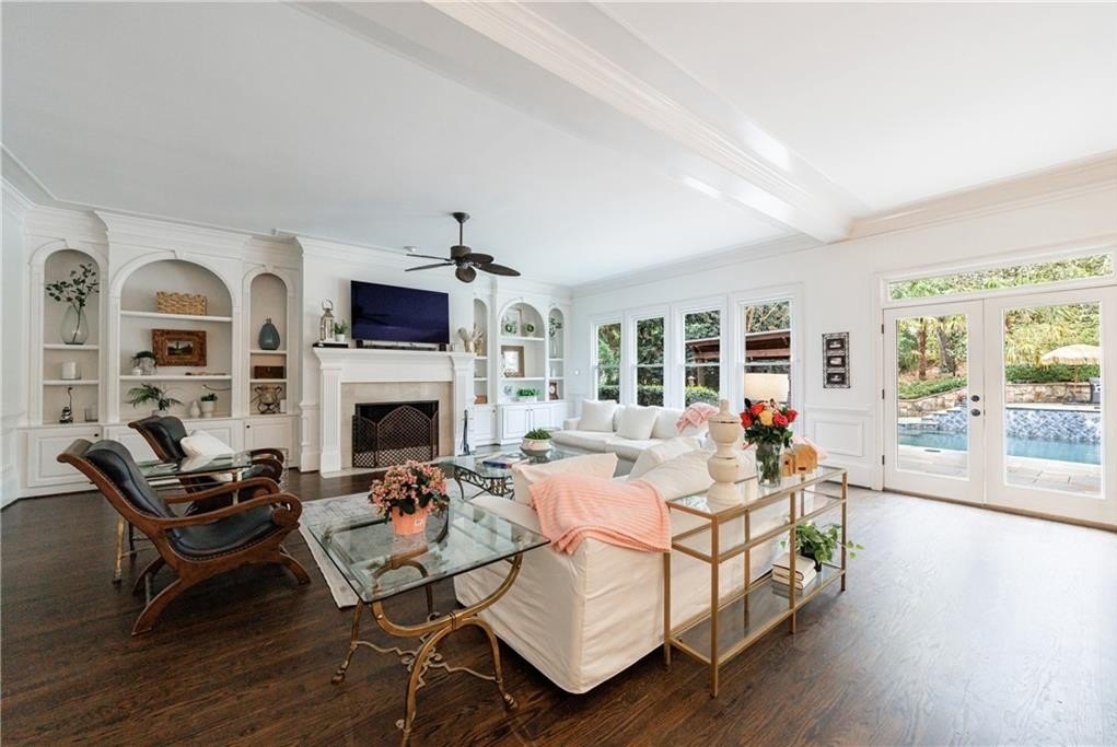 Upon entering through the elegant French doors, you'll be welcomed by an entry foyer with a striking central staircase. The formal living room seamlessly flows into the expansive keeping room featuring a fireplace flanked by built-in bookcases, creating a perfect space for entertaining. The banquet-sized dining room adjoins the chef’s kitchen, which boasts a 48-inch gas range, stainless steel appliances, a center island, and a generous breakfast bar. The sunlit breakfast room and keeping room overlook the beautiful pool area.