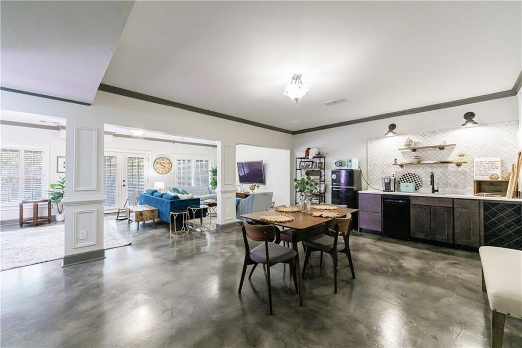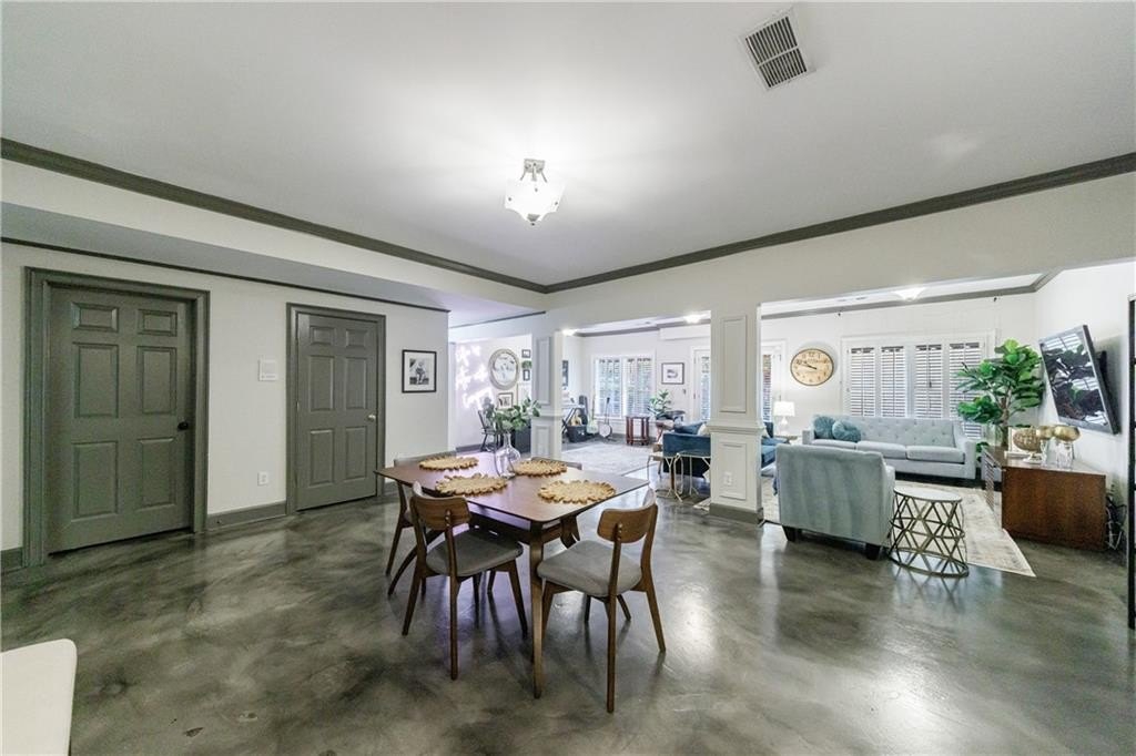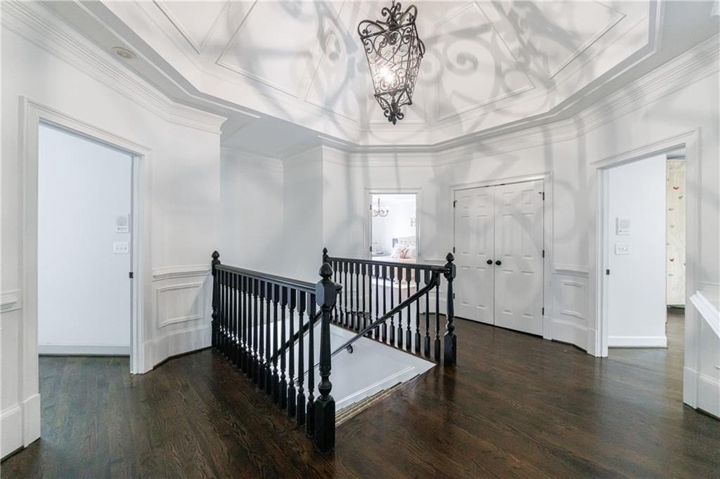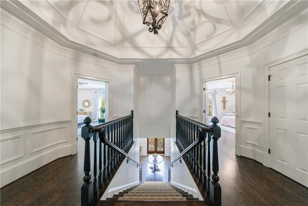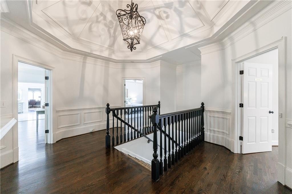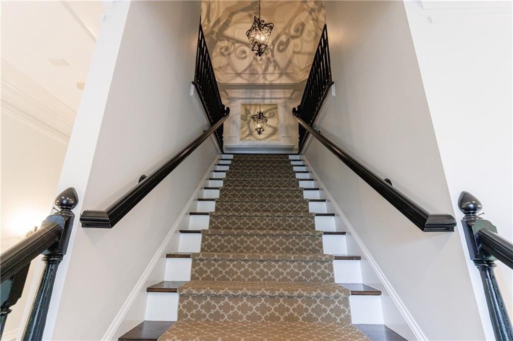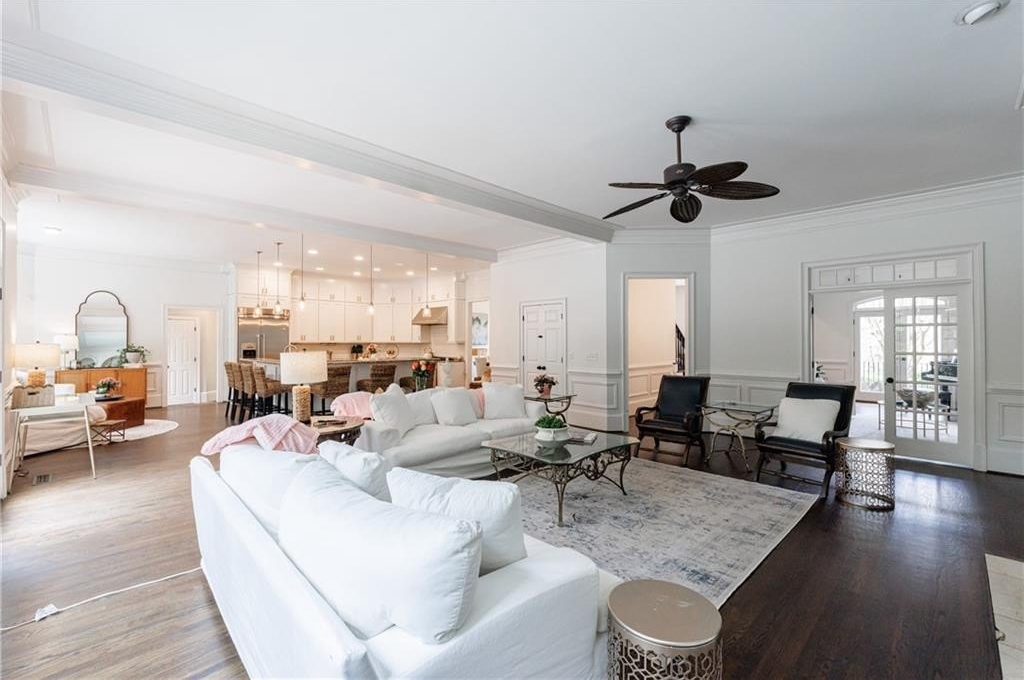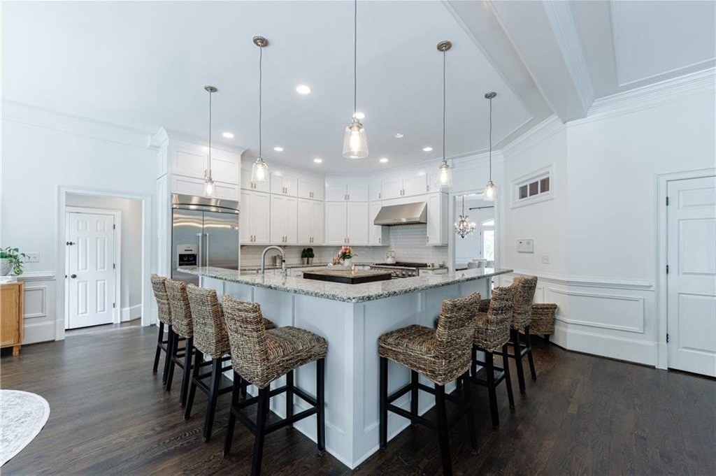 Upon entering through the elegant French doors, you'll be welcomed by an entry foyer with a striking central staircase. The formal living room seamlessly flows into the expansive keeping room featuring a fireplace flanked by built-in bookcases, creating a perfect space for entertaining. The banquet-sized dining room adjoins the chef’s kitchen, which boasts a 48-inch gas range, stainless steel appliances, a center island, and a generous breakfast bar. The sunlit breakfast room and keeping room overlook the beautiful pool area.