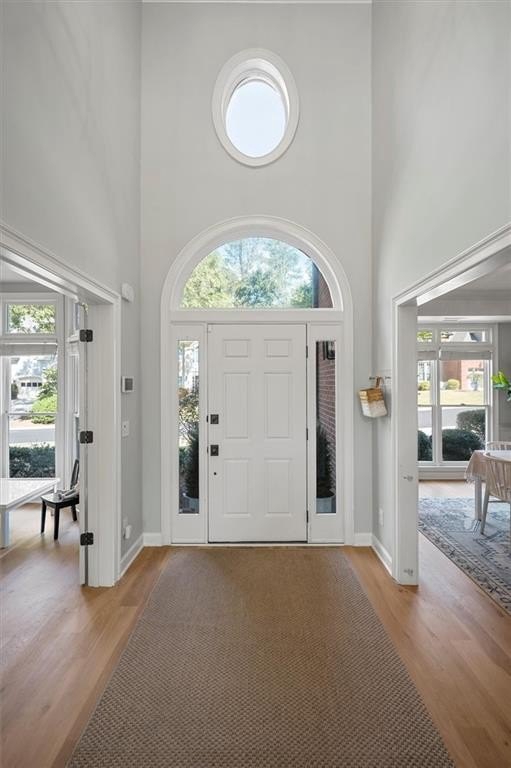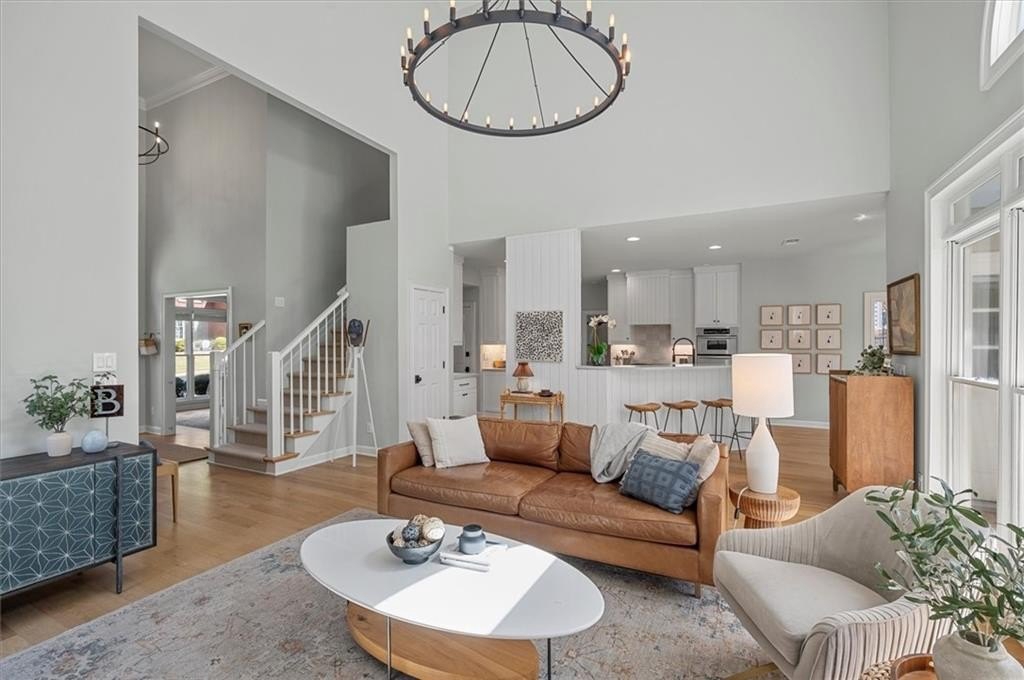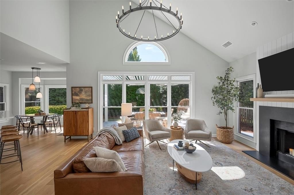 Inside, soaring ceilings and wide-plank white oak flooring create an inviting atmosphere.