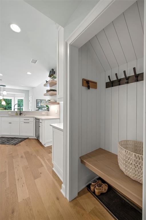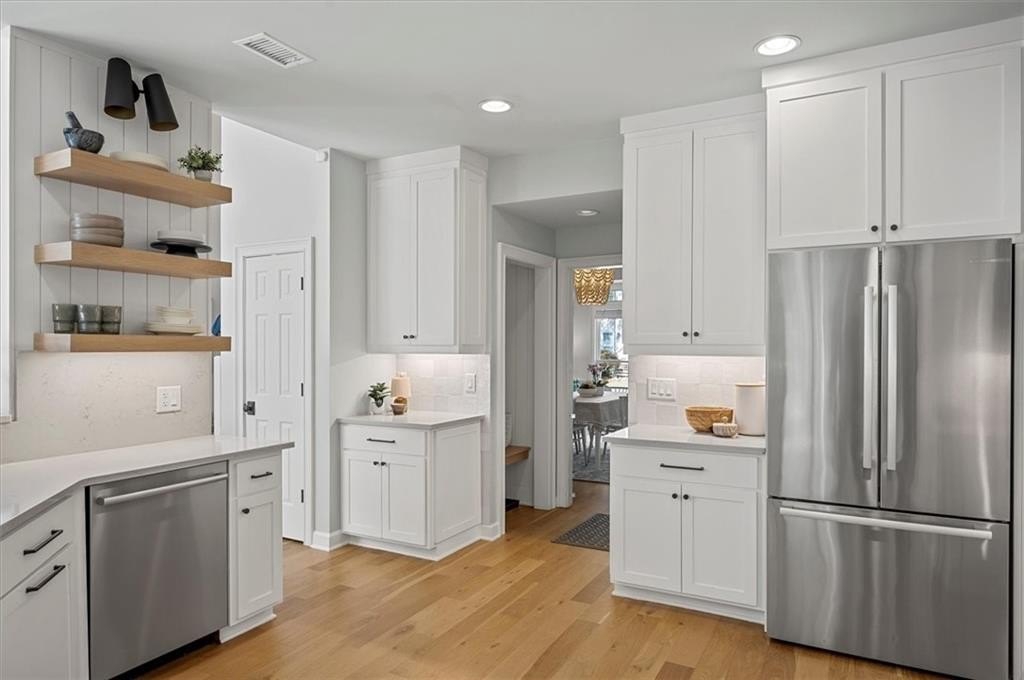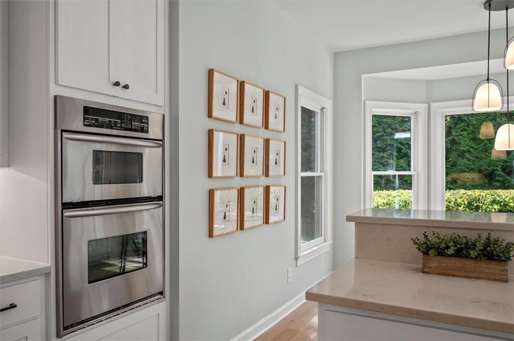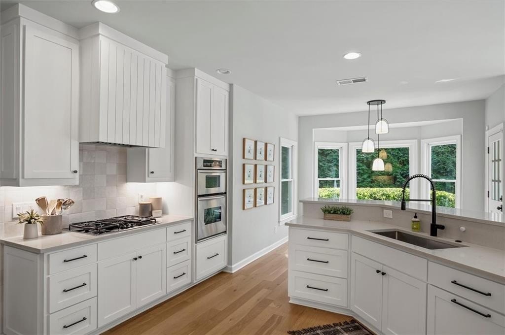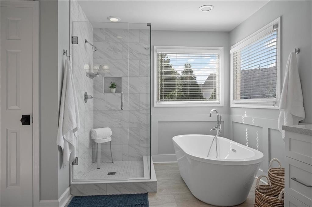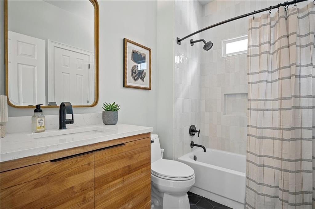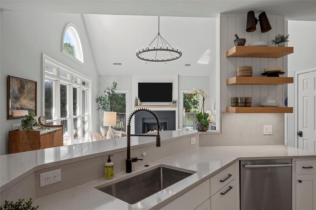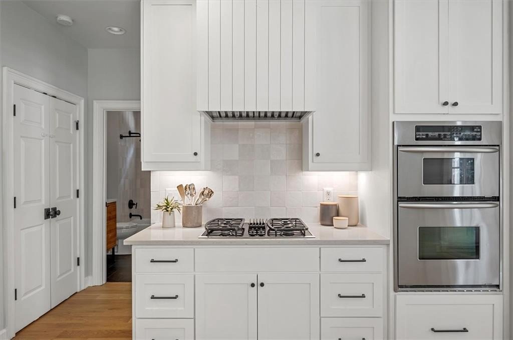 The kitchen features updated cabinetry, quartz countertops, and high-end finishes. It