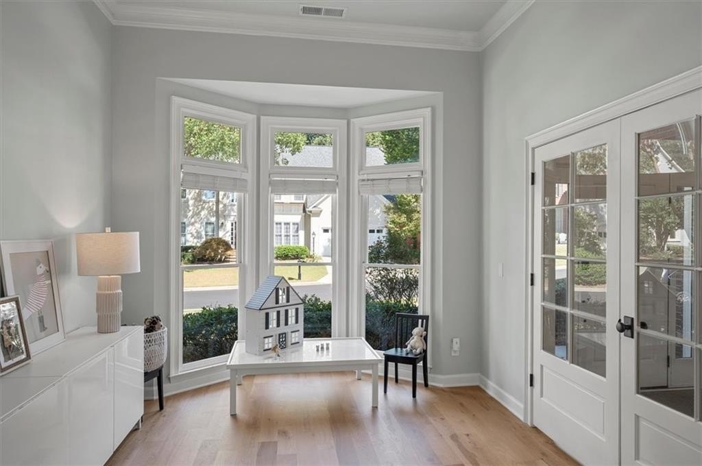 flexible bonus room with French doors can serve as a playroom, office, or den. The