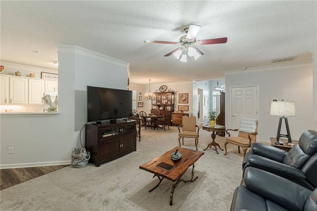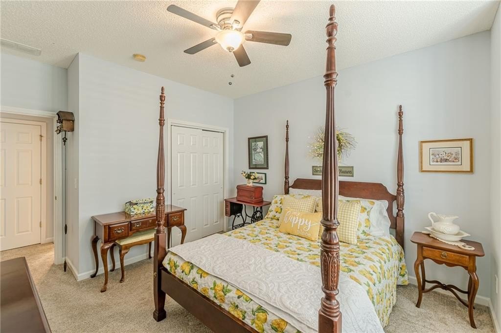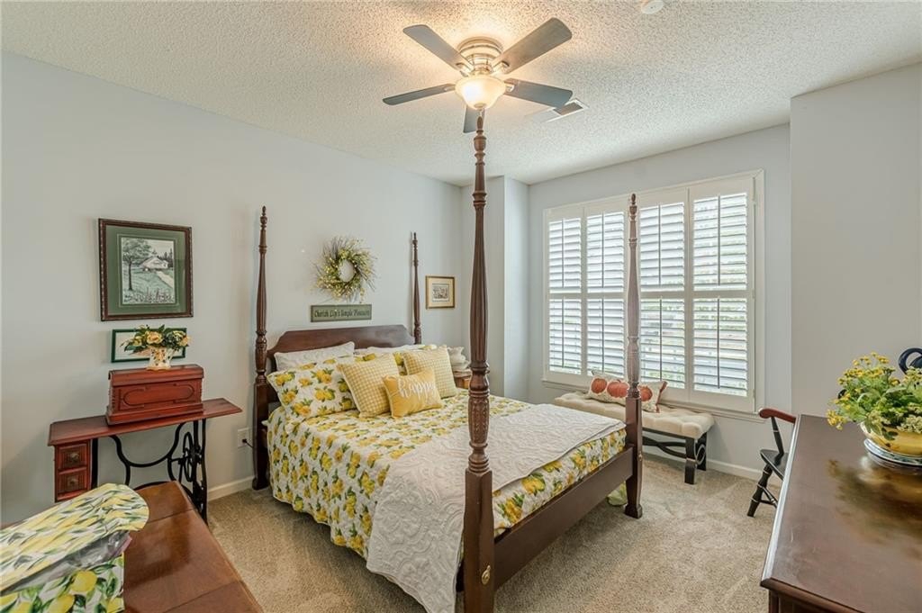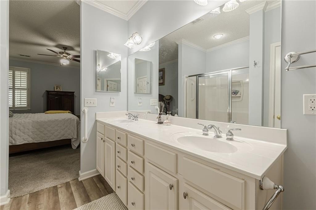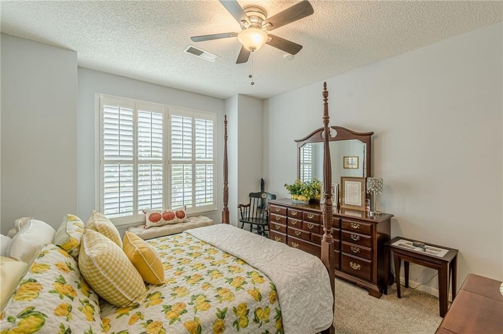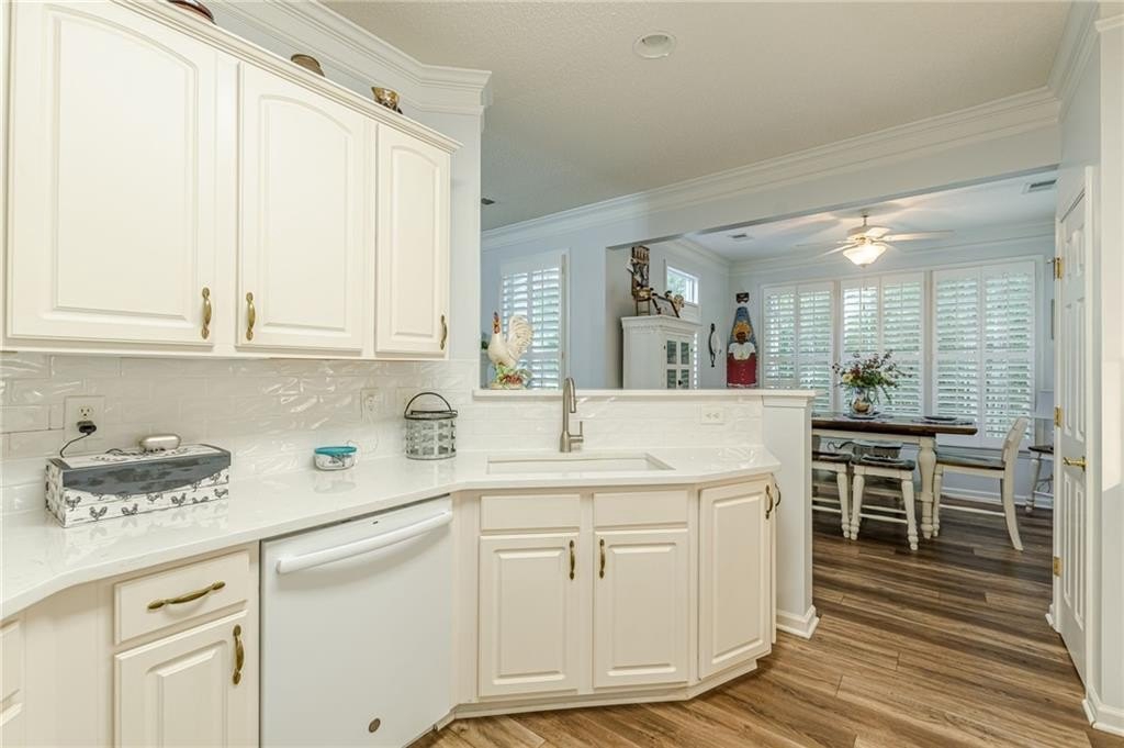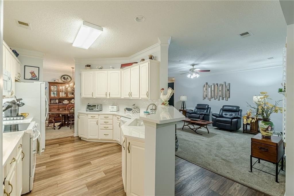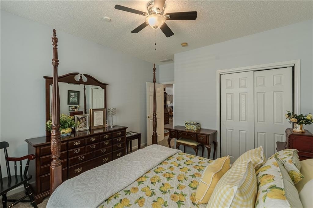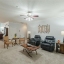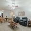 This inviting 2 bedroom, 2 bathroom home offers comfortable living with a spacious primary suite conveniently located on the main level. The large primary bathroom features double vanities, a separate shower, a relaxing soaking tub, and a generous walk-in closet. The split bedroom floor plan provides added privacy, with a blend of hardwood floors and cozy carpet throughout. The kitchen boasts beautiful stone countertops and overlooks the bright, open family room — perfect for everyday living and entertaining. Enjoy low-maintenance living in a peaceful, planned community that’s beautifully maintained and welcoming.