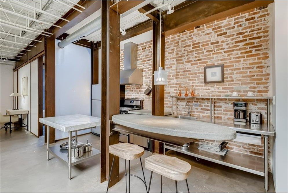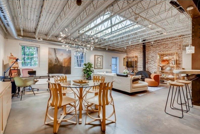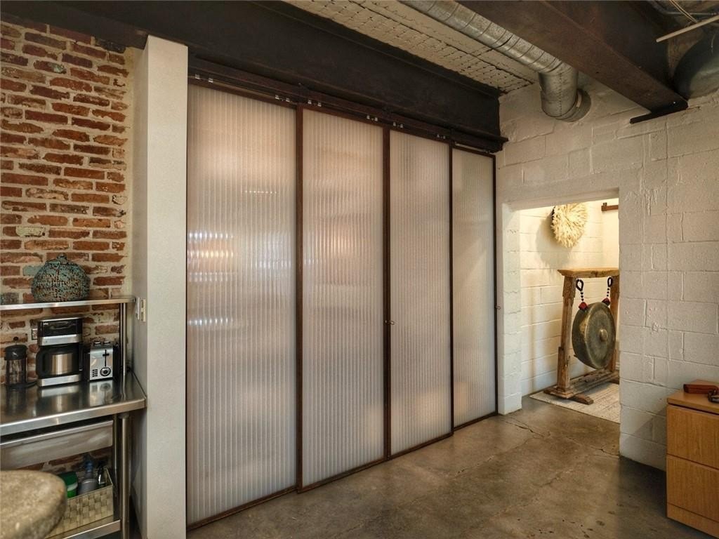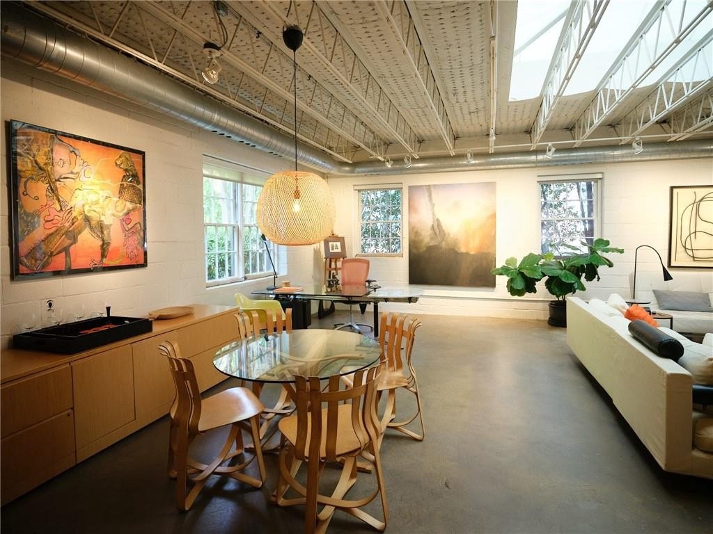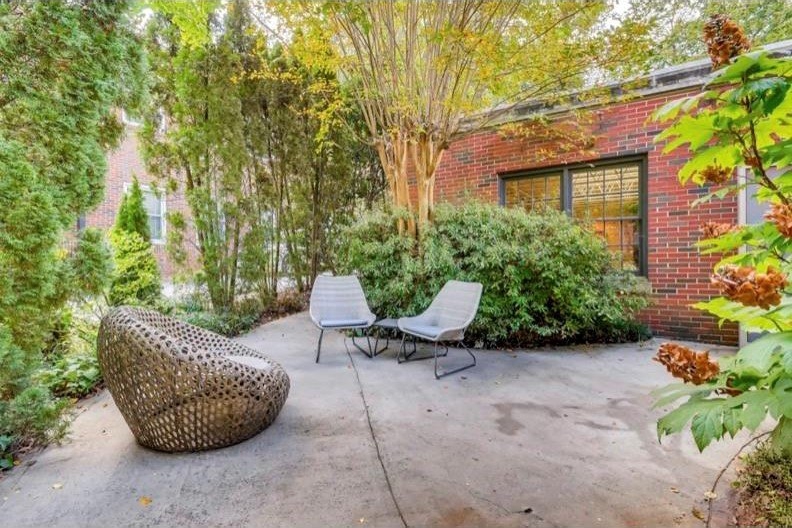 Nestled into a hill surrounded by a manicured landscape, this unique custom condominium residence is a light-filled dream. The massive 10 ft. square skylight, windows on 3 sides, entry foyer, along with the 2 exterior glazed doors, surround a large gallery-like setting for furniture, artwork, entertaining, and a live/work opportunity. Created by an award-winning International designer, Unit C is one of only 3 residences within a single story brick building in the sought-after Lake Claire neighborhood. And just a short walk down the street, between 2 parks, are the neighborhood market and 3 restaurants. The Industrial-chic interior of this home with soaring ceilings is highlighted by a sculptural wood-burning fireplace set against a feature wall of vintage mill brick with 2 portals to the bedroom behind. There are custom full height translucent steel-framed sliding doors throughout the space, a bank of which front a large pantry/closet adjacent to the open kitchen. A “surfboard” custom high-top sets the tone for casual dining at the kitchen, which is equipped with stainless appliances, gas range, range hood, and polished Calacatta marble front island counter. Step into the gorgeous 4-fixture bathroom, tiled floor-to-ceiling with a rare Vermont mottled slate, creating a soothing refuge with free-standing artisan soaking tub, open shower, euro toilet, and a cast stone vanity with custom lighting. The large bedroom again features a vintage mill brick wall, windows to the back terrace, and a walk-in closet. The Lutron lighting scene control panel is at hand here. As you make your way back out the front through the foyer, you pass the separate laundry/utility room with Included washer and dryer. There is a relaxing patio/lounging area at the entry, and a private side door from the living room with steps into the gated rear area. With a granite-paved terrace for grilling within the fenced back yard…very dog friendly…these outdoor features combine to create a truly unique residential experience.