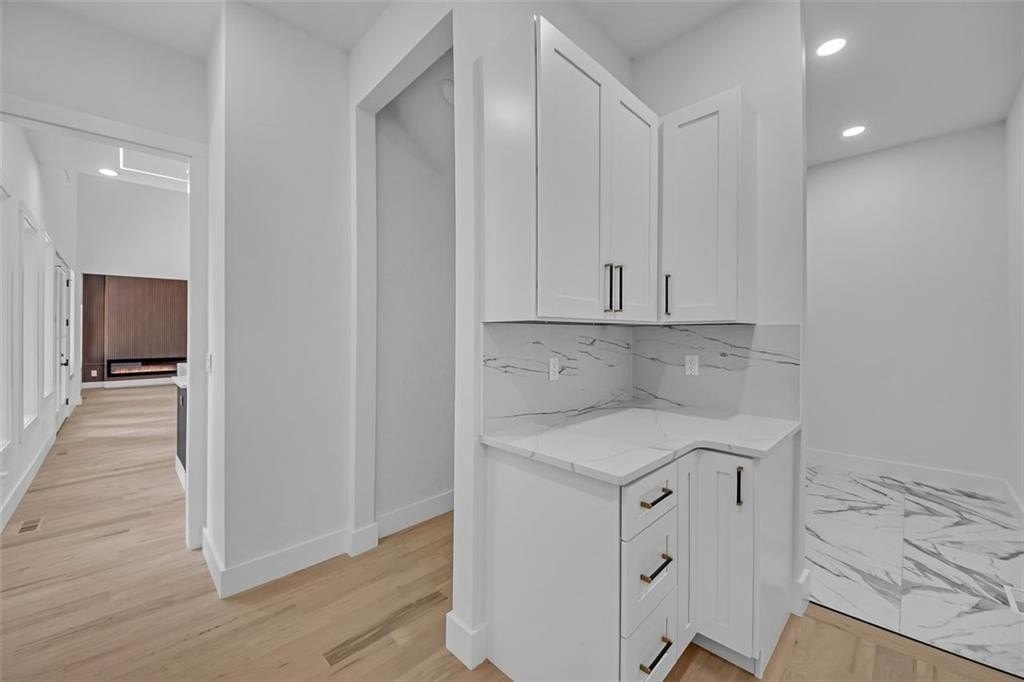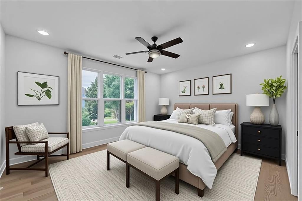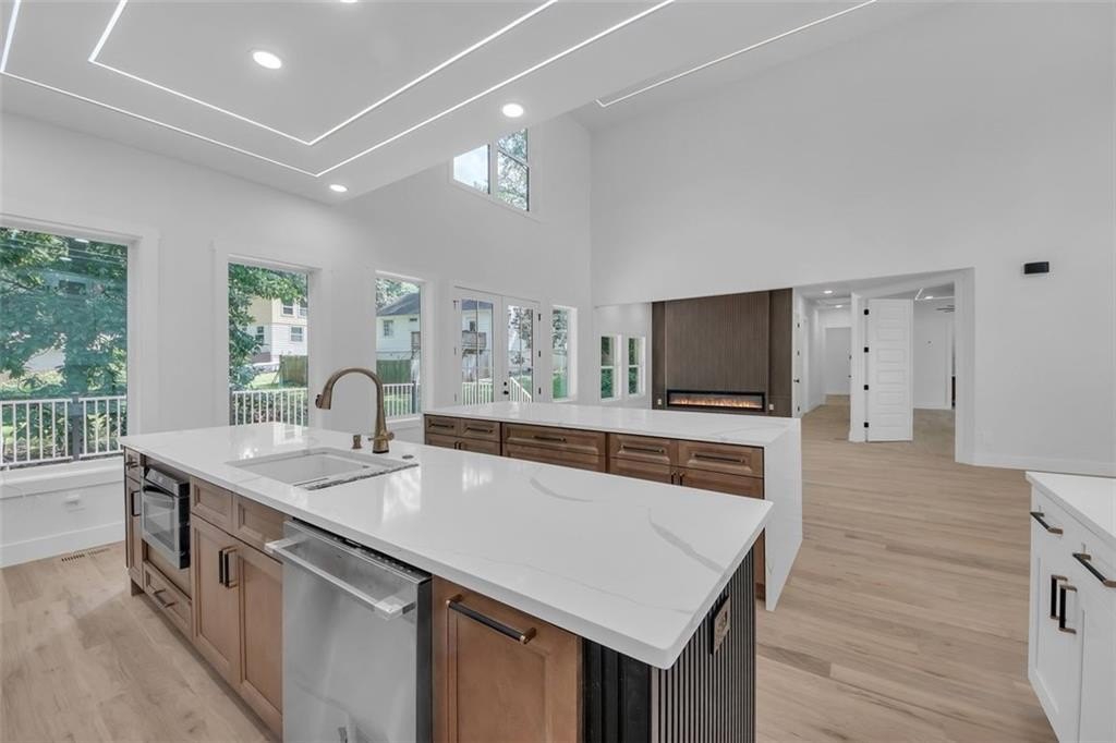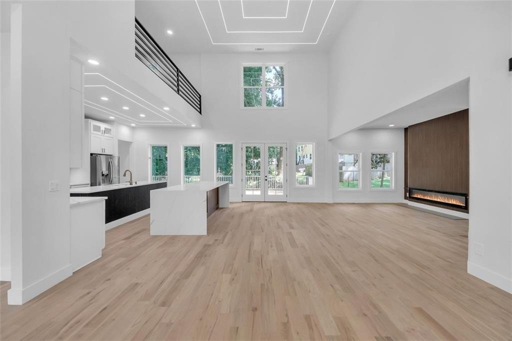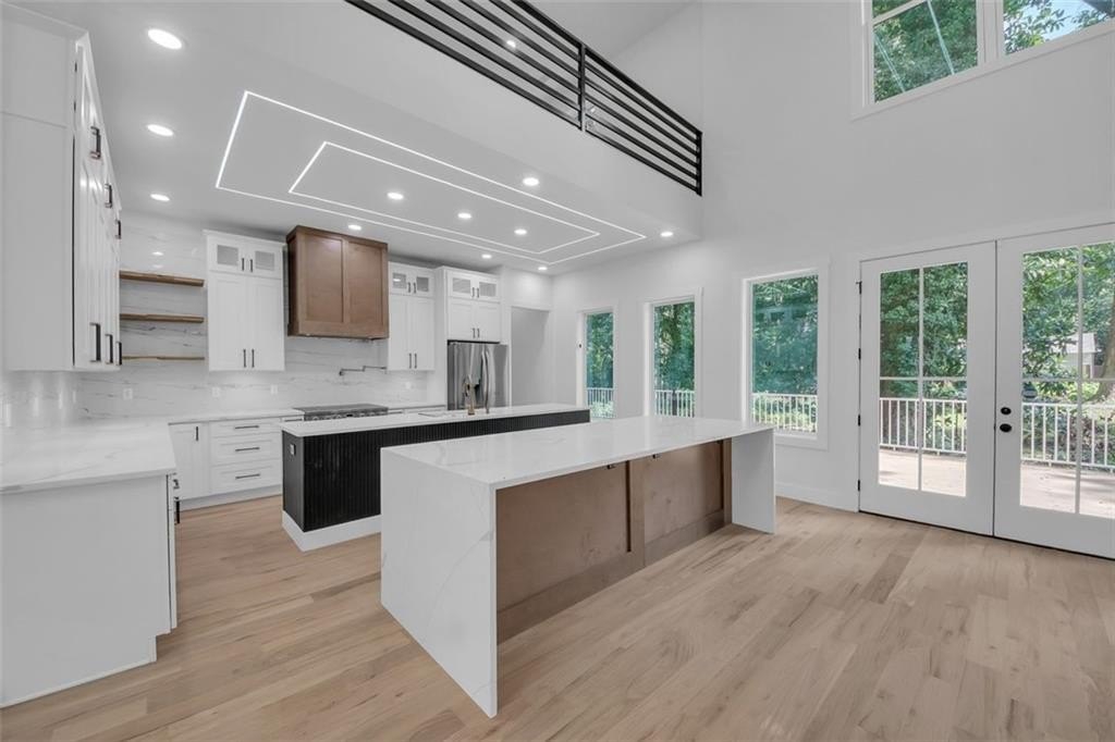 The chef’s kitchen is a true showstopper, featuring two oversized islands and quartz countertops ideal for both daily living and entertaining. The main-level primary suite offers a spa-like escape with a soaking tub, glass walk-in shower, dual vanities, walk-in closet, and a private electric fireplace. A guest suite with a full bath is also located on the main floor.