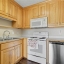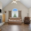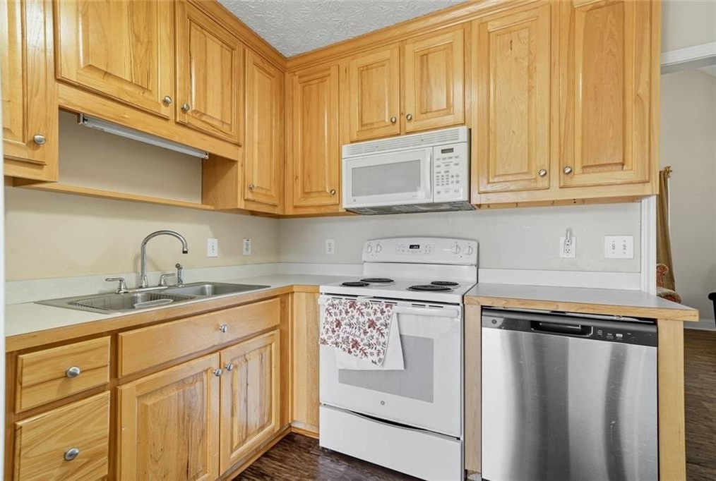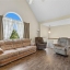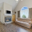 The main floor features an inviting living room with a stone fireplace and large arched window that fills the space with natural light. The adjoining kitchen includes solid wood cabinets, white appliances, and a double sink beneath a sunny window. A nearby dining area connects easily to the back deck, making outdoor dining simple.