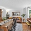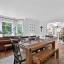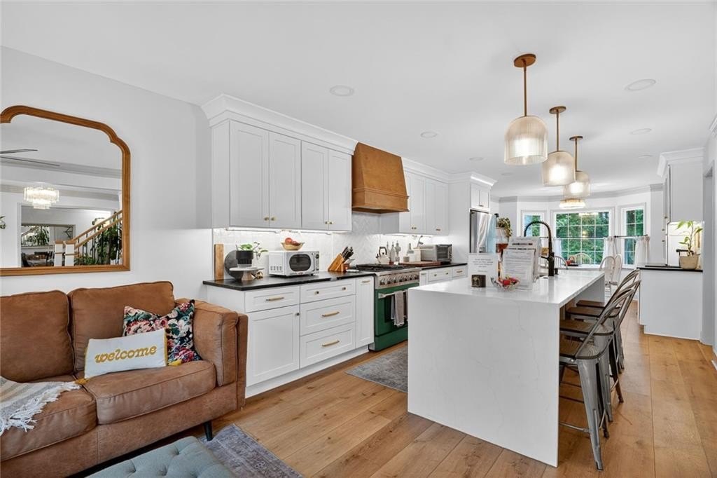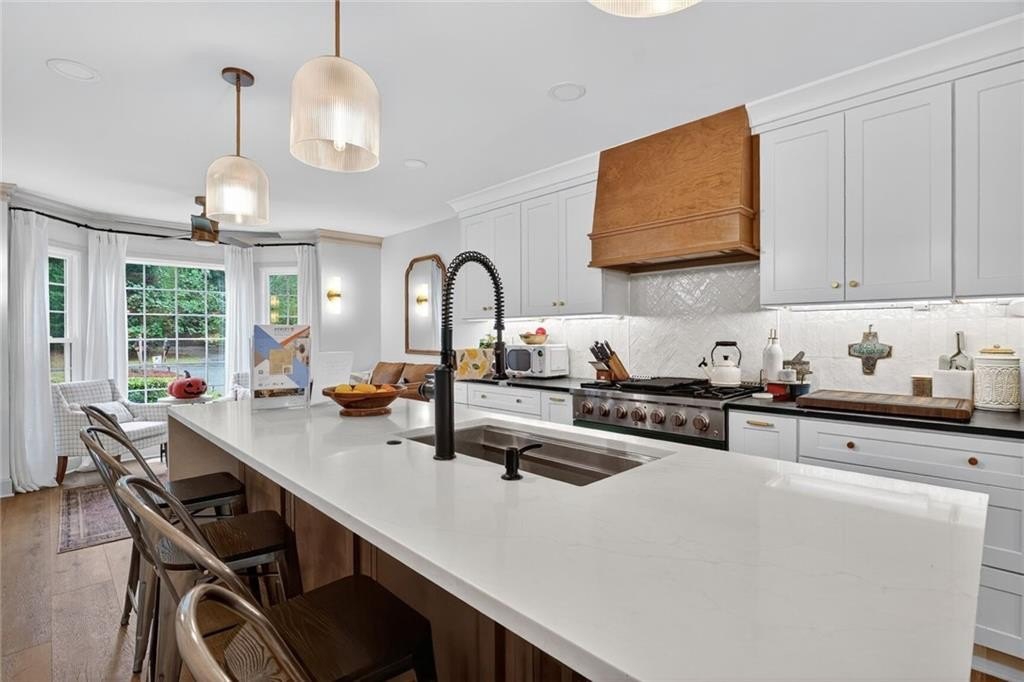 • Chef’s Kitchen: Soapstone perimeter countertops, a dramatic 9-ft opal marquette quartz island with waterfall edge, Zellige tile backsplash with under-cabinet lighting, appliance garage with hidden outlets, and elegant pinch-pleat curtains framing bay windows overlooking the pool.
