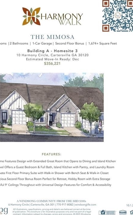 Welcome to Windsong's newest townhome community in Cartersville! All homes offer the primary bedroom on the main floor, with thoughtfully crafted, open floorplans and quality finishes. The fantastic Mimosa plan has a secondary bedroom and full bath on the main level, a wonderful island kitchen with soft close cabinet doors opening to the large dining area and great room. The inviting owner's suite features a large low-threshold shower with bench seat, designer tile floor and walls with shampoo niche. Second floor features a spacious bonus room for second living area. 9' ceilings throughout the main level. Insulated garage doors, irrigation system - all of the top quality features you expect to find in a Windsong Community!