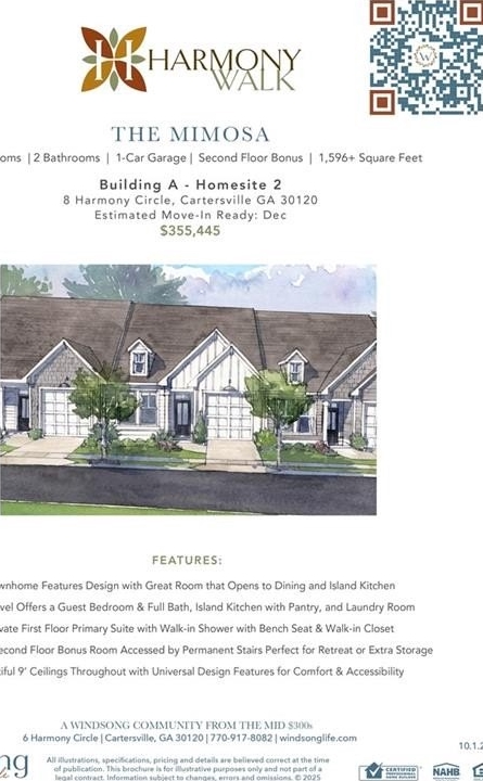 Welcome to Windsong's newest townhome community in Cartersville! All homes offer the primary bedroom on the main floor, with thoughtfully crafted, open floorplans and quality finishes. The fantastic Mimosa plan has a secondary bedroom and full bath on the main level, a wonderful island kitchen with soft close cabinet doors opening to the large dining area and great room. The inviting owner's suite features a large low-threshold shower with bench seat, designer tile floor and walls with shampoo niche. Second floor features a spacious bonus room for second living area. 9' ceilings throughout the main level. Insulated garage doors, irrigation system - all of the top quality features you expect to find in a Windsong Community!