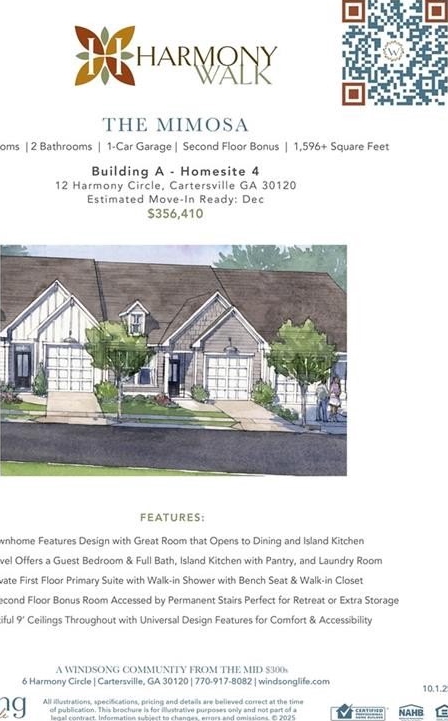 Welcome to Windsong's newest townhome community in Cartersville! All homes offer the primary bedroom on the main floor, with thoughtfully crafted, open floorplans and quality finishes. The fantastic Mimosa plan has a secondary bedroom and full bath on the main level, a wonderful island kitchen with soft close cabinet doors opening to the large dining area and great room. The inviting owner's suite features a large low-threshold shower with bench seat, designer tile floor and walls with shampoo niche. Second floor features a spacious bonus room for second living area. 9' ceilings throughout the main level. Insulated garage doors, irrigation system - all of the top quality features you expect to find in a Windsong Community!