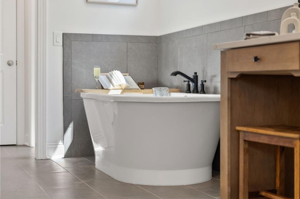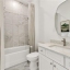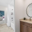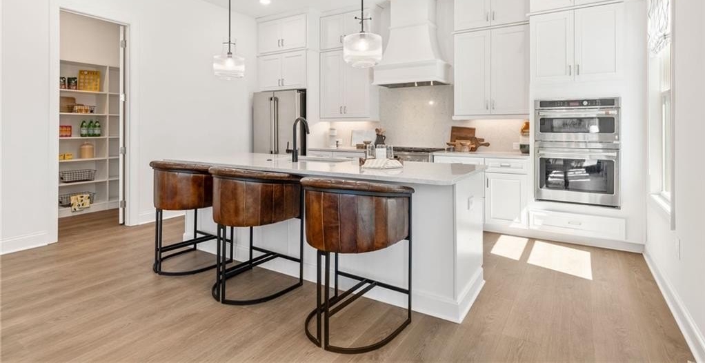 Luxury features in these homes include oversized kitchen islands with quartz countertops, 42-inch cabinets, and spacious walk-in pantries. The primary bedrooms boast tray ceilings and generously sized walk-in closets. The primary bathrooms come equipped with a free-standing tub and comfort-height toilets, along with quartz countertops in both the primary and secondary baths. Raised-height vanity cabinets and white rectangular undermount sinks add a touch of elegance.
