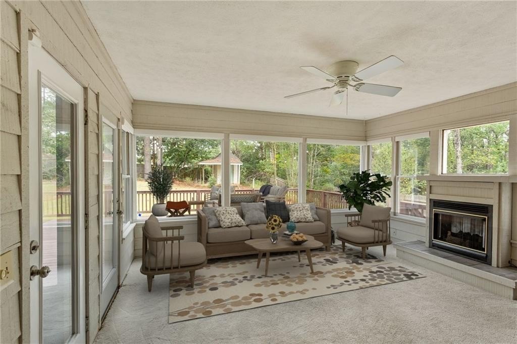 The heart of the home is the kitchen: crisp white cabinetry, granite counters, tile backsplash, stainless steel appliances, a generous pantry, and an island with seating. It’s practical, polished, and ready for casual breakfasts or serious entertaining. A bright sunroom with its own fireplace adds a serene spot for morning coffee or an evening read.