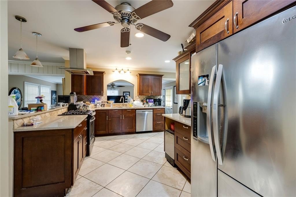 The kitchen features solid-surface counters, stainless appliances, and a breakfast bar that opens to the cozy fireside family room. Enjoy the bright sunroom overlooking the fenced backyard and peaceful koi pond, perfect for morning coffee or relaxing evenings.