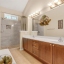 From the family room, head to the right into the spacious owner’s suite—a peaceful retreat with a trey ceiling, ceiling fan, and large walk-in closet. The private ensuite bathroom includes double vanities, a newly tiled oversized shower with a low step-in threshold, vaulted ceilings, a linen closet, tiled flooring, and a private water closet.