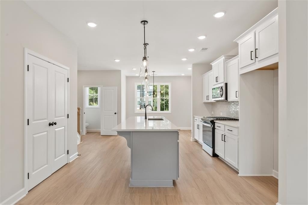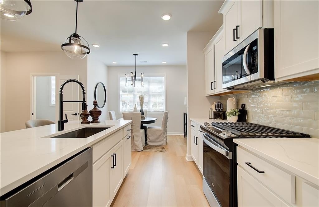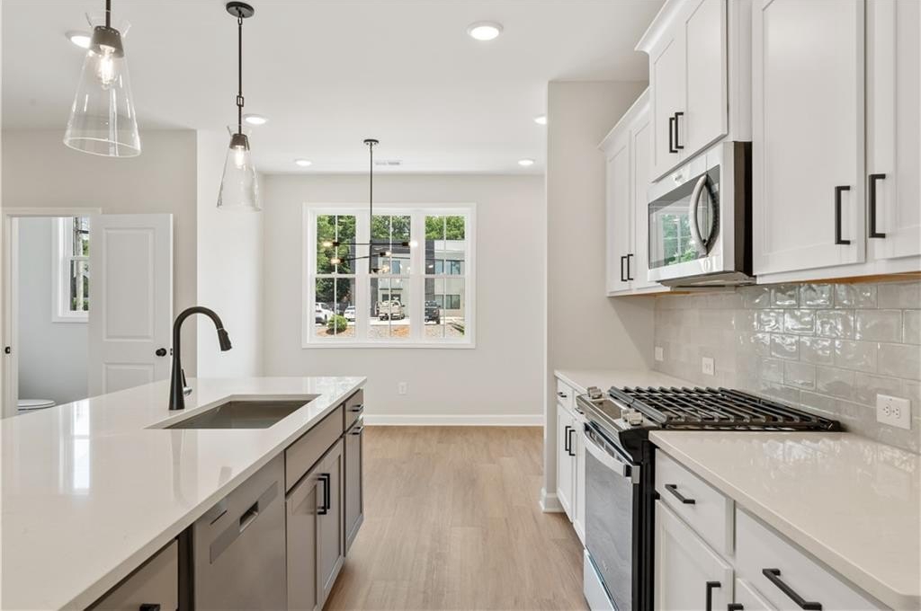 TRATON HOMES KAUFMAN B THIS HOME INCLUDES A REFRIGERATOR, WASHER AND DRYER PACKAGE. Traton Homes is also offering $5000 toward closing costs along with our preferred lender who is offering up to $10,000 towards closing costs. The Kaufman features a rear entry 2 car garage with a ground floor bedroom/office and full bath. You will enjoy hardwood stairs from the terrace level that lead up to your main level. Here you will find a spacious open concept kitchen with shaker cabinets, quartz tops, gas cooking and an island that can seat 4 comfortably. The family room offers a sleek, modern electric fireplace that can put out heat (cold weather is coming) or just set the mood. The family room opens to a 10'x18' covered deck for perfect for entertaining. Hardwood stairs lead you to the upper level where you will find the king-sized Owner’s suite with a large vanity and dual sinks, large shower with bench and spacious custom closet. The secondary bedroom on this floor has a private bath and is separated from the primary suite offering privacy. The laundry is located between these bedrooms for your convenience. East Park Village has a great amenity package including Cabana with fireplace, pool and Dog Park. We are within walking distance of several shops and restaurants and just 1.2 miles from trendy Downtown Kennesaw. East Park Village was named Best Neighborhood in Cobb County for 2024. Come See Why! We are open 7 days a week. Some photos are representative or of the model.