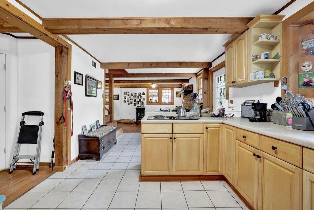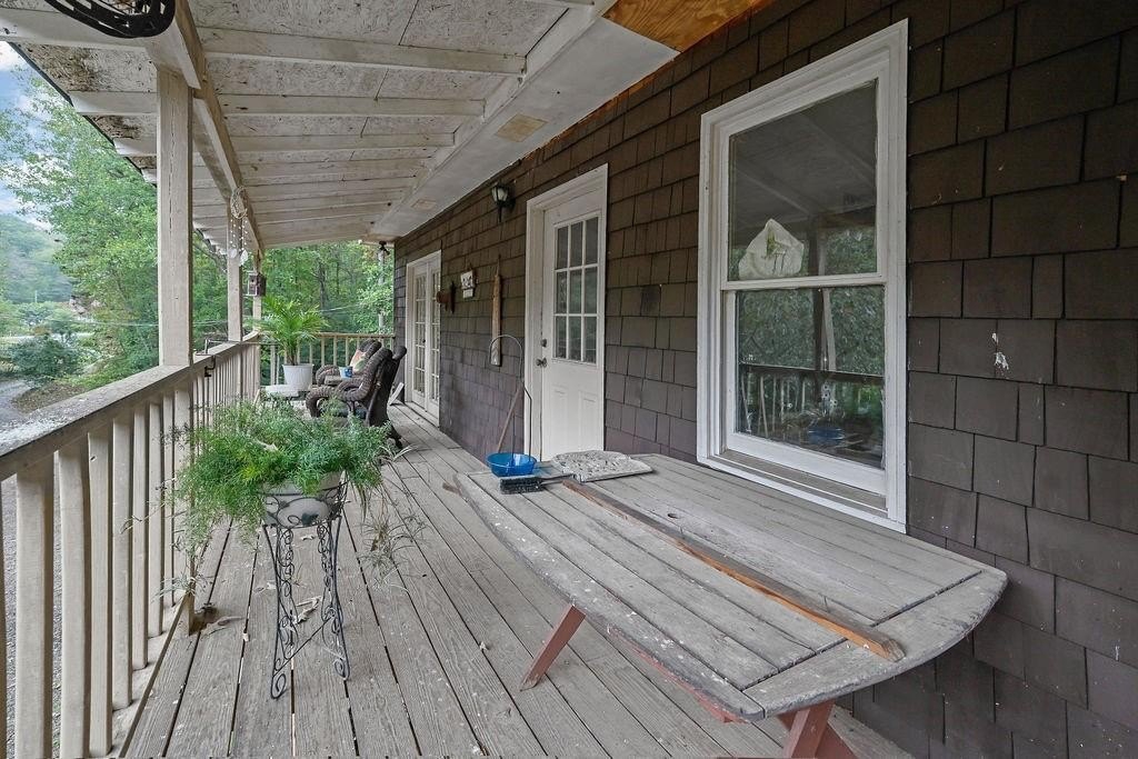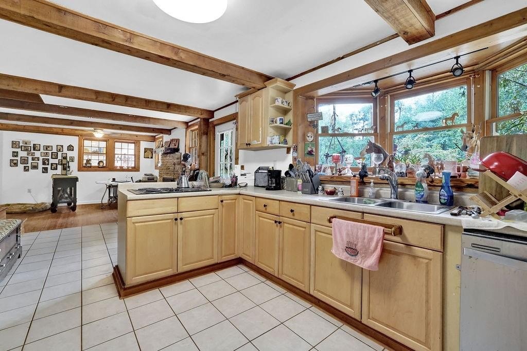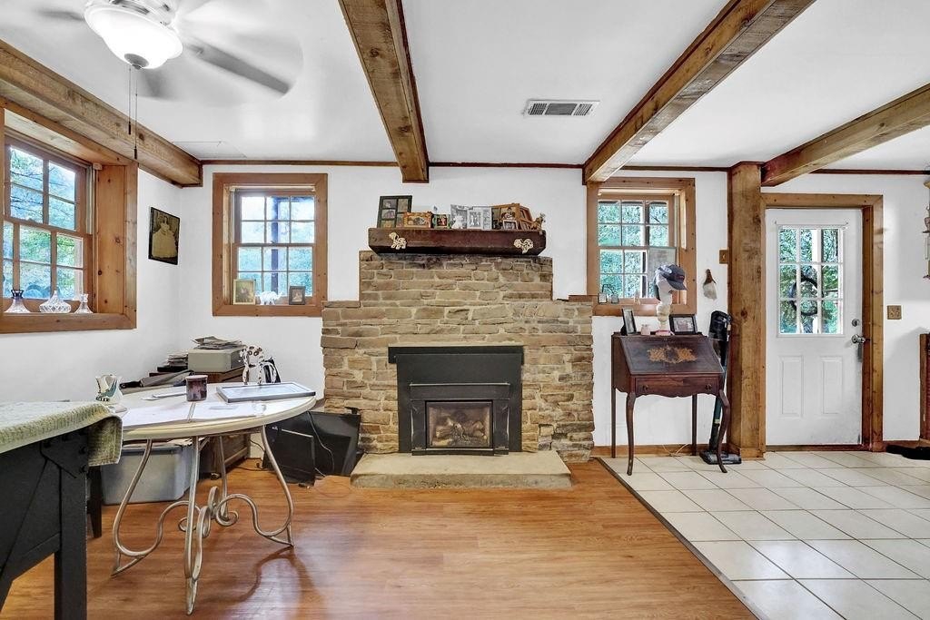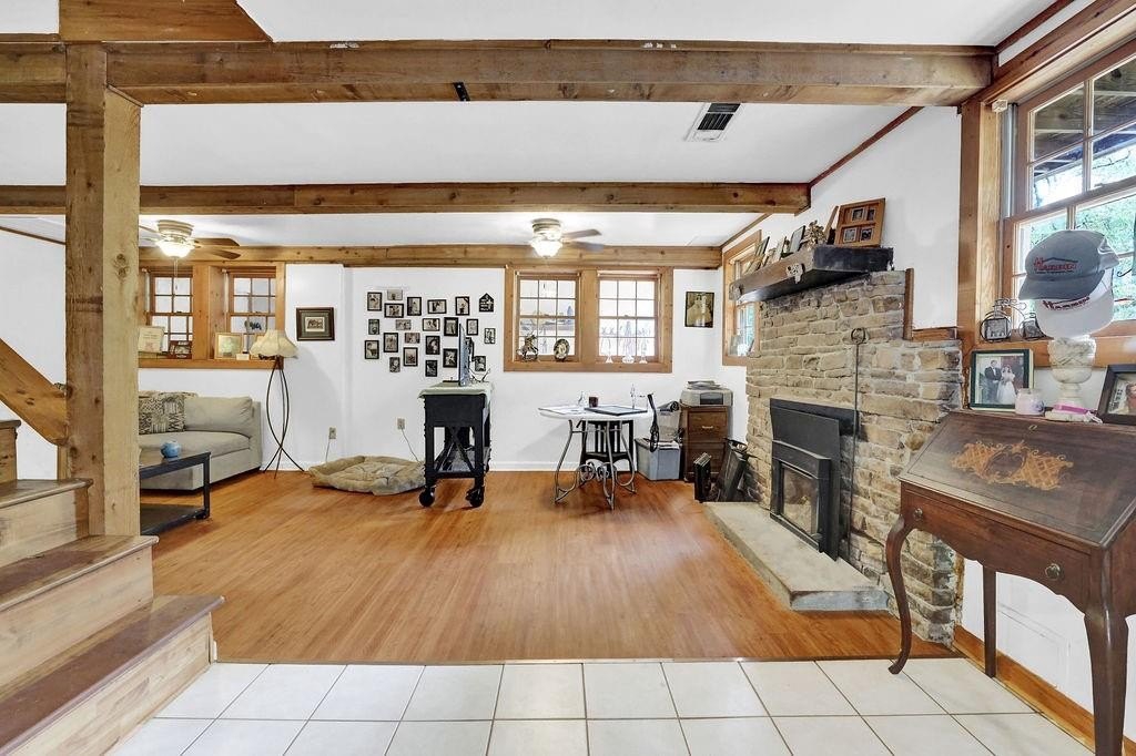 Inside, you’ll find stunning exposed wood beams on the main level, updated bathrooms with modernized showers & tubs, plus a kitchen featuring a stainless steel refrigerator and dishwasher. Two covered porches provide the perfect spots to relax and take in the peaceful surroundings.